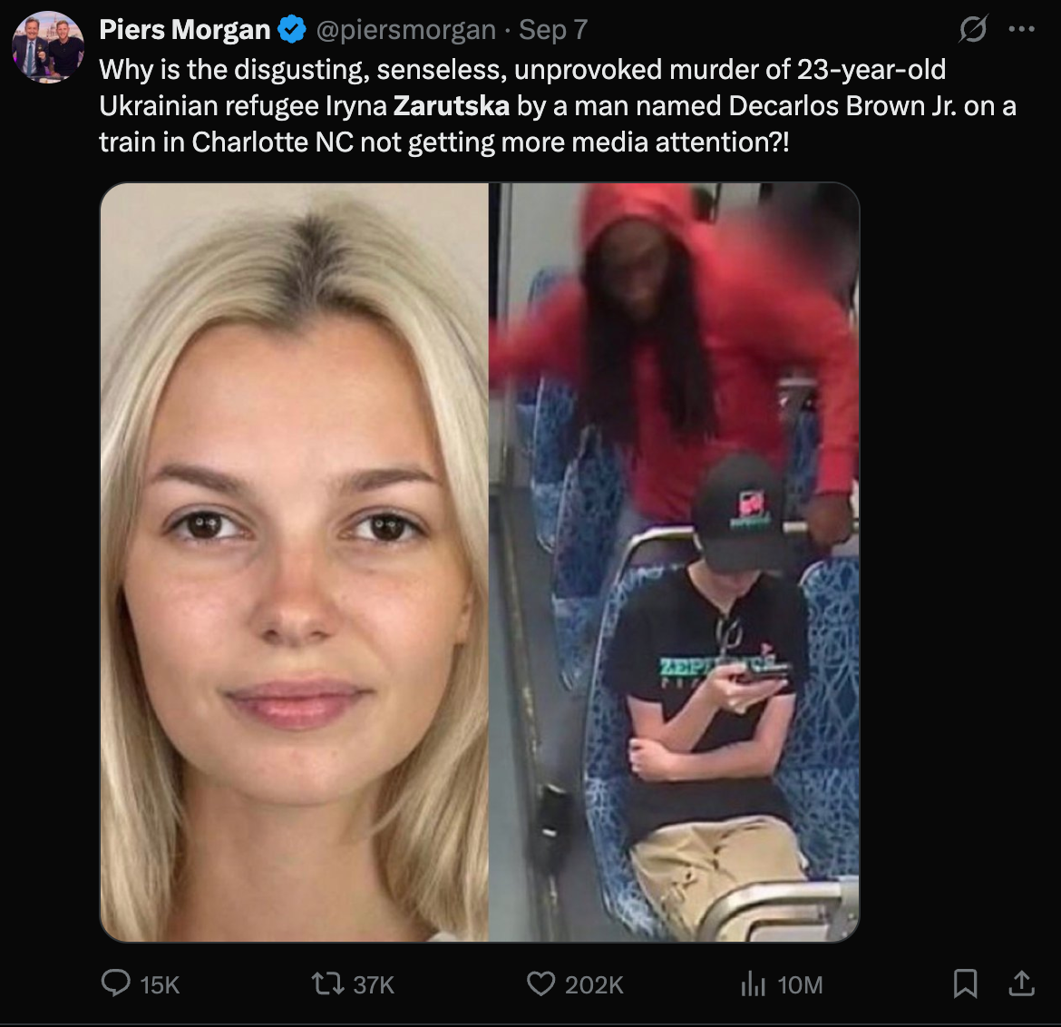 Серед публікацій є допис журналіста Пірса Моргана, де він поставив запитання, чому це вбивство не отримує більше уваги ЗМІ.