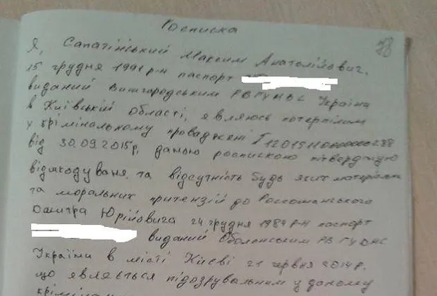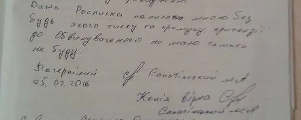 Розписка від чоловіка Світлани про відсутність претензій до Россошанського