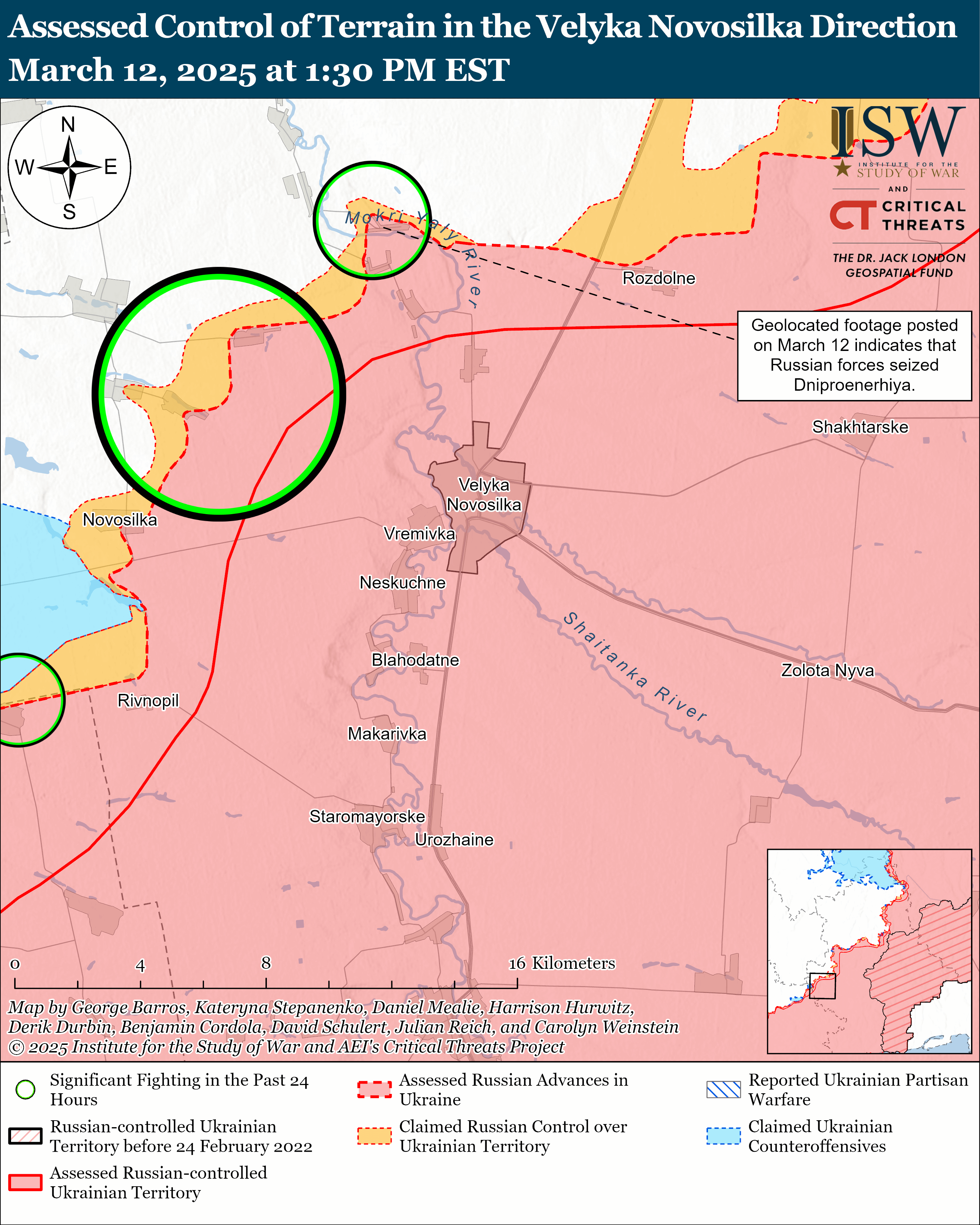 - 12 березня російські війська продовжили наземні атаки на заході Запорізької області, але не зробили жодного підтвердженого просування. Така сама ситуація була на Дніпровському напрямку.