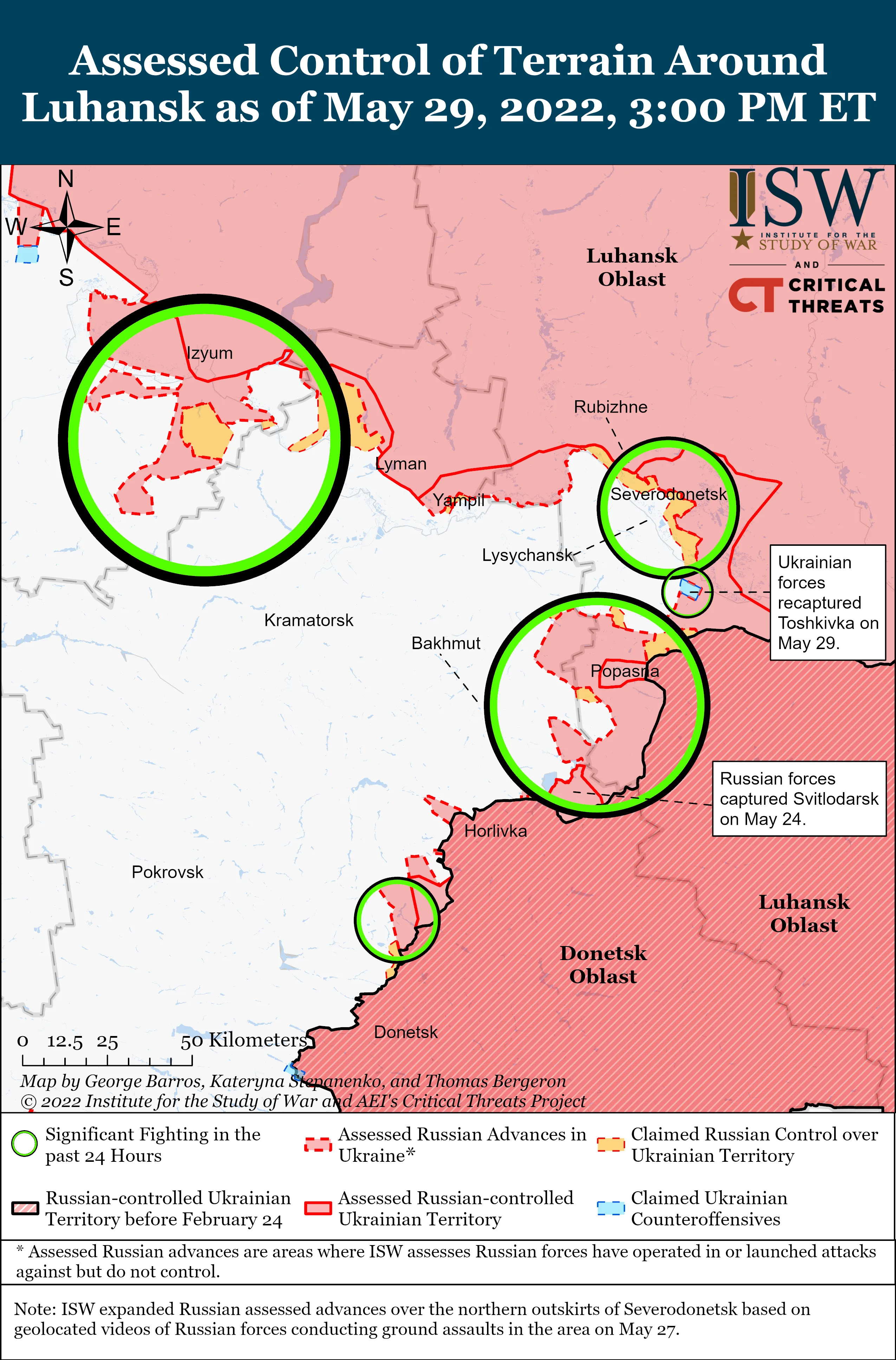 Російський прогрес в інтенсивних міських боях, ймовірно, буде повільним. Російська кампанія на сході України, яка раніше мала на меті захопити всю Луганську та Донецьку області, тепер майже повністю зосереджена на Сєвєродонецьку,