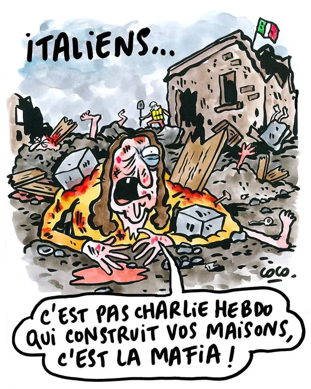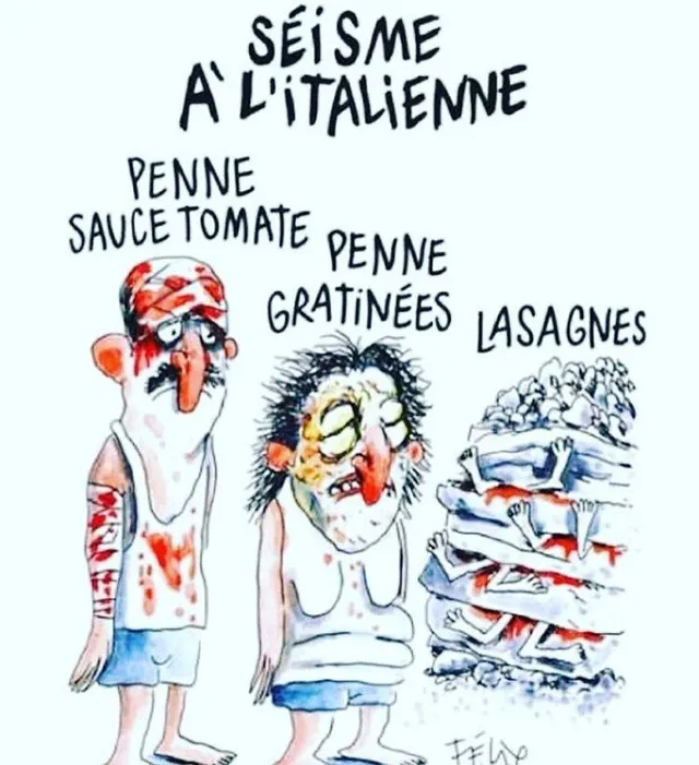 "Це груба, безглузда і безсовісна образа жертв катастрофи. Критика, навіть в сатиричній формі, є непорушним правом громадян Франції та Італії, однак не все може бути сатирою, і в даному випадку ці карикатури ображають пам'ять жертв землетрусу і місто Аматріче", – заявив адвокат Маріо Чіккетті.