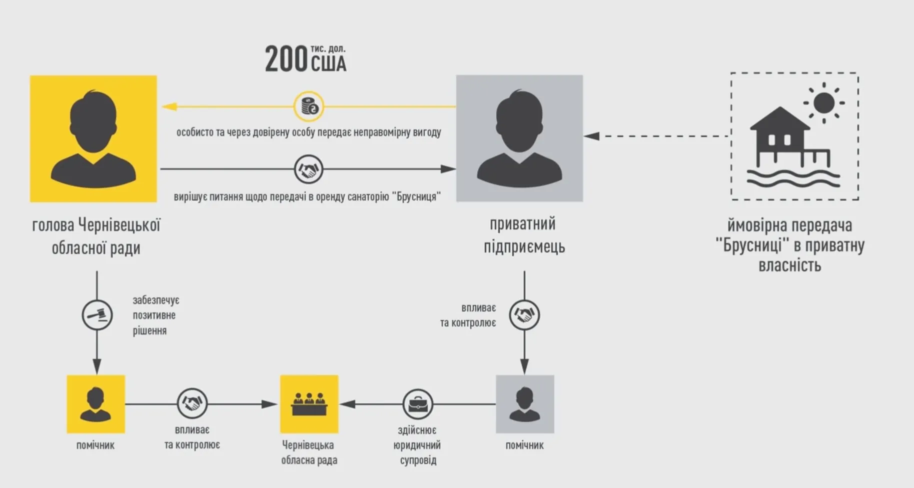 В обмін він пообіцяв посприяти у передачі в оренду санаторію "Брусниця". Слідство задокументувало, що упродовж серпня-жовтня 2019 року голова Чернівецької облради отримав частину суми – 180 тисяч доларів. За даними НАБУ, підприємець передавав цю суму як особисто, так і через свого помічника.