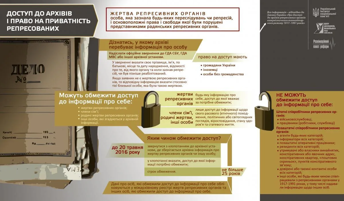 Відкрив архіви КДБ та інших радянських спецслужб. Прийнятий у 2015 році закон передбачає відкриття архівів усіх репресивних органів СРСР в Україні з 1917 по 1991 рік. З того часу усі ці архіви передаються Інституту національної пам'яті та розсекречуються. Тепер Україна – одна з країн пострадянського простору, де доступ до архівів КДБ найпростіший. Для доступу до архівів КДБ потрібні мінімальні вимоги – достатньо вказати в запиті інформацію про людину, про яку шукають відомості. За доступ не потрібно платити, копіювання документів теж безкоштовне.