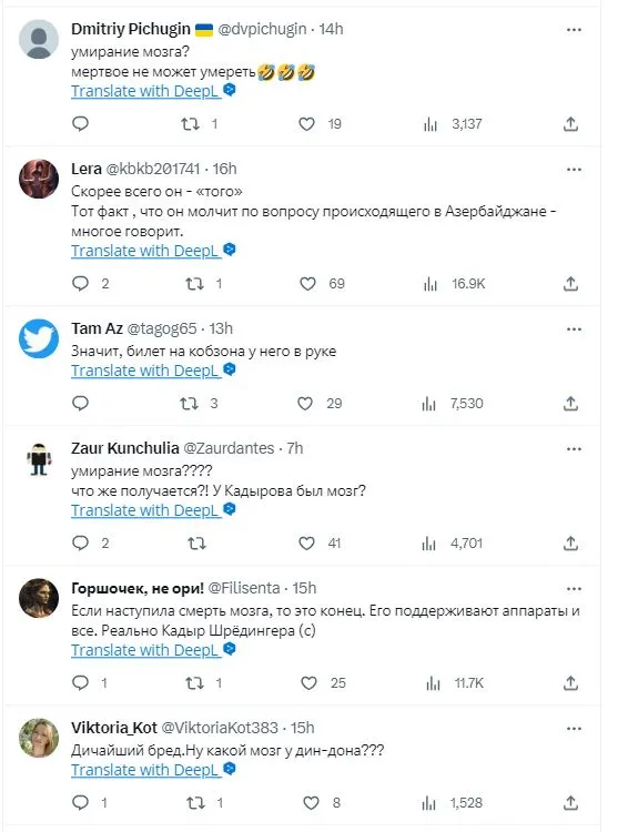 У мережі жартують, що це "Кадиров Шрьодінгера" – чи то мертвий, чи то живий. Поки що інформація про стан голови Чечні суперечлива і офіційно ніхто не оголосив про його смерть.