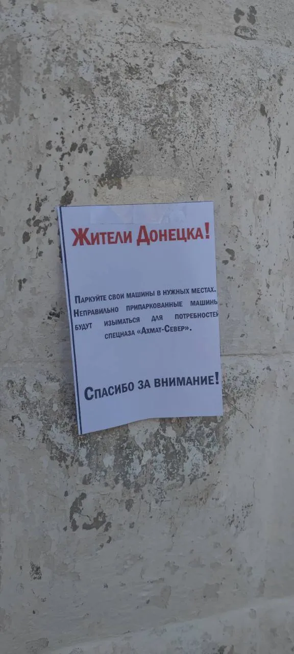 Тік-ток батальйон Кадирова "Ахмат" вже в Донецьку та намагається встановити свої правила. Окупанти розвісили оголошення, у якому мовиться, що машини потрібно паркувати в "правильних місцях". Мовляв, якщо машина буде запаркована "неправильно", її заберуть для потреб батальйону "Ахмат-Північ".
