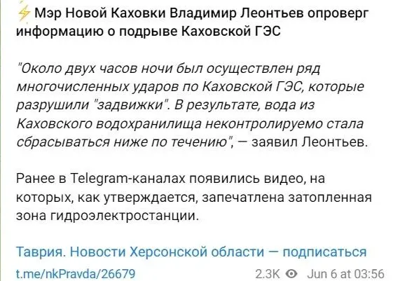Ближче до 4 ранку у деяких групах чи ЗМІ почали з'являтися повідомлення від "мера" Нової Каховки, про те, що "внаслідок обстрілів ГЕС з боку ЗСУ сталося руйнування засувок". Тобто почалися перекладання відповідальності за подію на Київ, а також спроби применшити наслідки інциденту (зазвичай, звинувачуючи Україну у чомусь, загарбники намагаються навпаки перебільшувати).