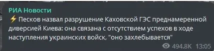 Перші повідомлення про руйнування греблі ГЕС у російських спільнотах у телеграм з'явилися майже водночас із безпосередньо її підривом. Адміністратори пабліків прямо писали про те, що "командування віддало наказ змити нацистів". Згодом, як і у випадку з телесюжетом про збитий український військовий літак, яким виявився Boeing Малайзіських авіаліній, рашисти повидаляли всі згадки про свою причетність до злочину.