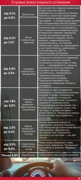 Зазначимо, що керувати автомобілем не можна навіть в самій легкій стадії. А ті 0,2 проміле, які українське законодавство визначає як безкарний рівень алкоголю в крові, залишені на той випадок, якщо рівень алкоголю відрізняється від нуля через ті самі індивідуальні особливості або певні захворювання (діабет, діарея, карієс), також – при вживанні деяких продуктів.