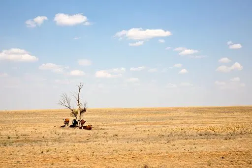 Подекуди пісок просто "ковтає" рослини та підходить впритул до загонів з худобою. У 2020, каже Ердні, трава тут майже не росла. Якщо 2021 буде такий самий, вижити буде складно, вважає він. Син просить батька відпустити його в пустелю на пошуки черепа корови, який той десь бачив. Батько дозволяє.
