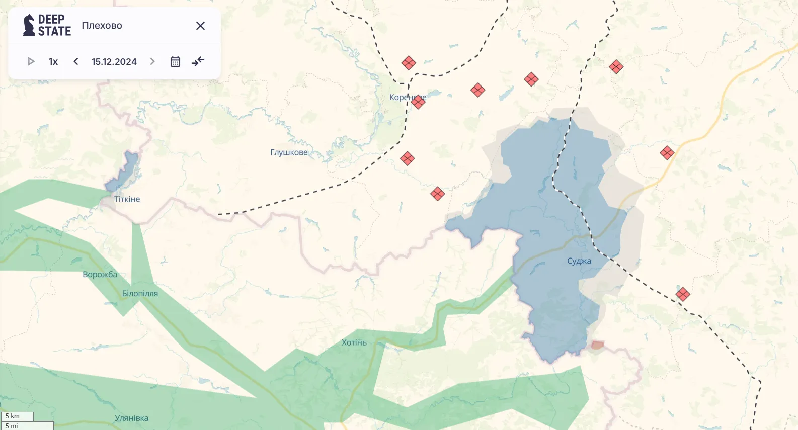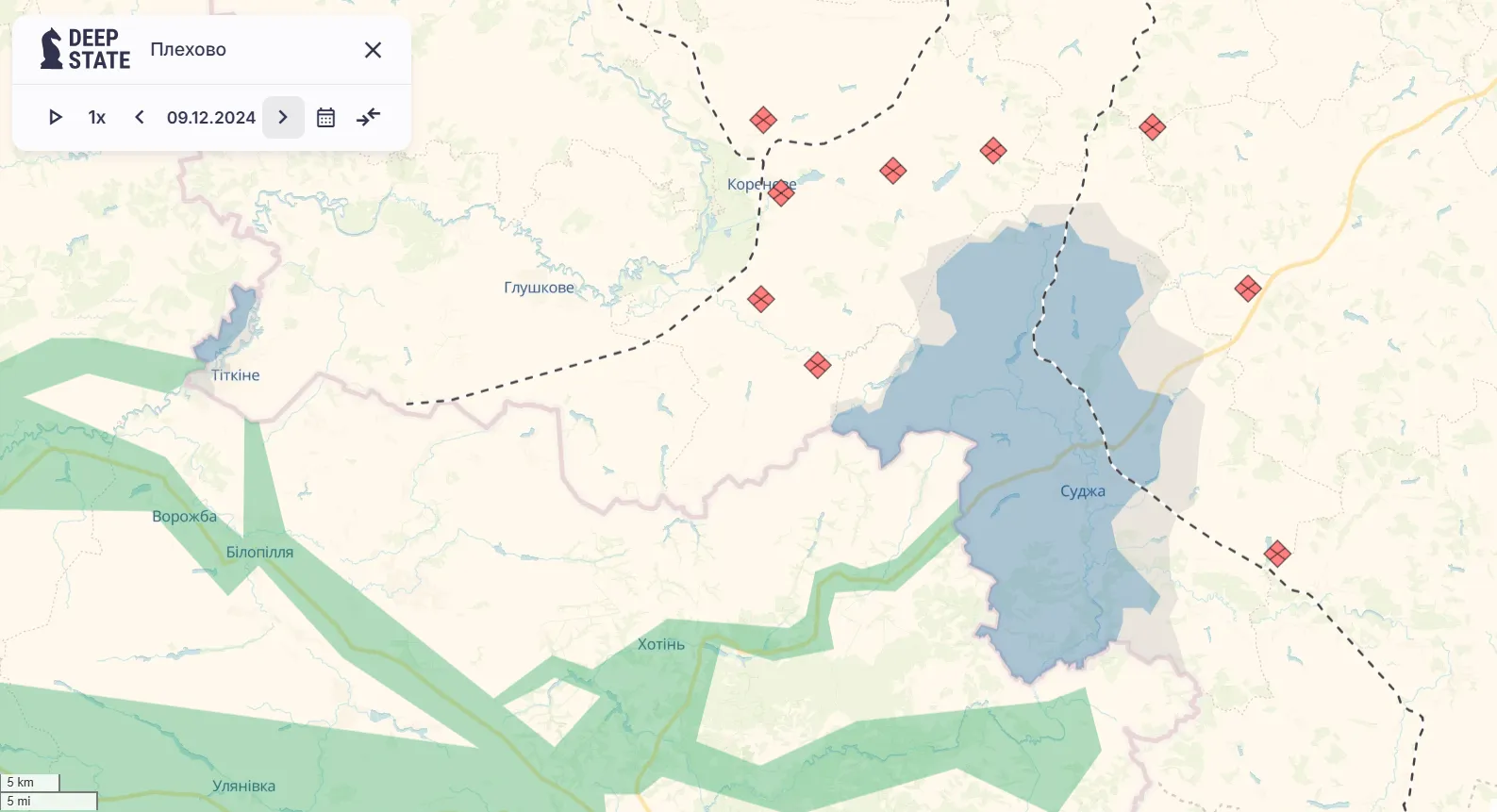 Щодо змін фронту: росіяни повернули контроль над невеликою територією в південно-східній зоні підконтрольної ЗСУ частини Курщини. Силам оборони довелося посунутися від Пльохово ближче до річки Псел. Також, за інформацією DeepState, росіянам вдалося зайти на територію Сумської області. Територія, яку попередньо контролює ворог, становить трохи менш як 2 кілометри квадратних. Водночас у ДПСУ не підтверджують захід ворожих військ на Сумщину.