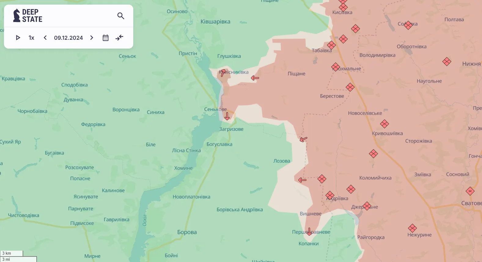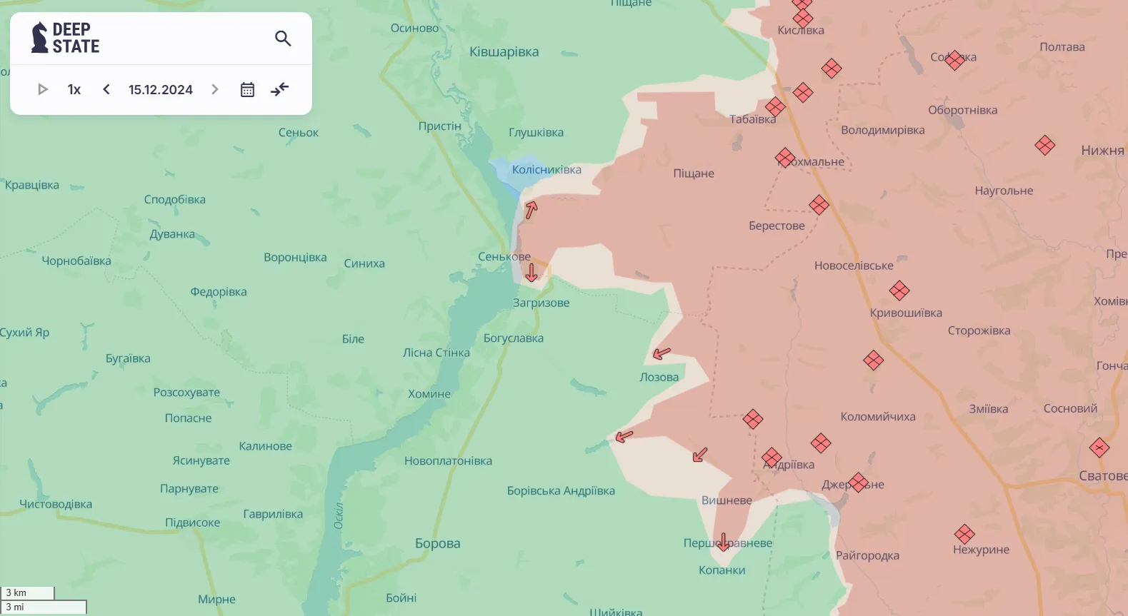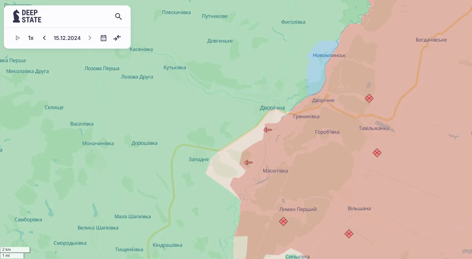 Також росіяни не полишають ідеї повторної окупації міста Куп'янськ Харківської області. На початку грудня українським військам вдалося ліквідувати плацдарм окупантів на західному березі річки Оскіл у Новомлинську. Проте присутність ворога лишалася в іншому місці, трохи південніше – в районі Масютівки. DeepState пишуть, що плацдарм там поступово перетворюється на плацдарм у Дворічній.