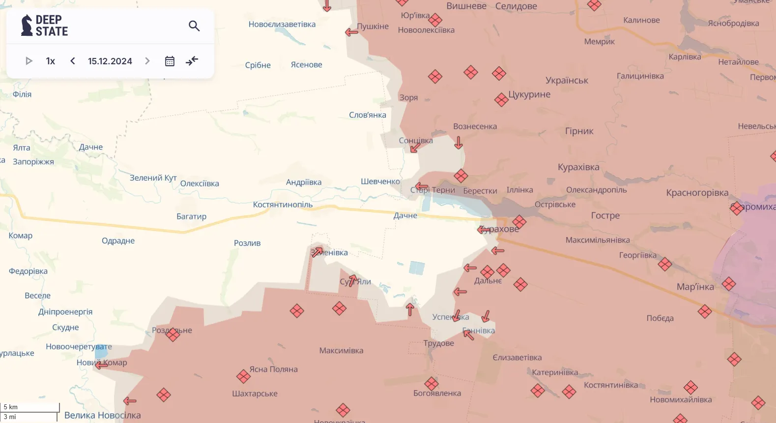 Особливої уваги потребує ситуація південніше Курахового. Йдеться про так званий успенівський мішок. На початку тижня DeepState писали, що оперативна обстановка там погіршується. Ключовими місцями називалися Єлизаветівка – Романівка – Веселий Гай – Ганнівка, які перебувають безпосередньо в мішку, а також Трудове – Успенівка – Дальнє, які відіграють основну роль в утриманні.