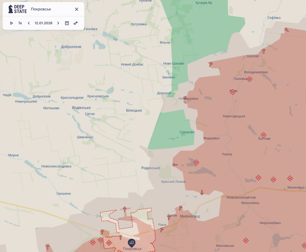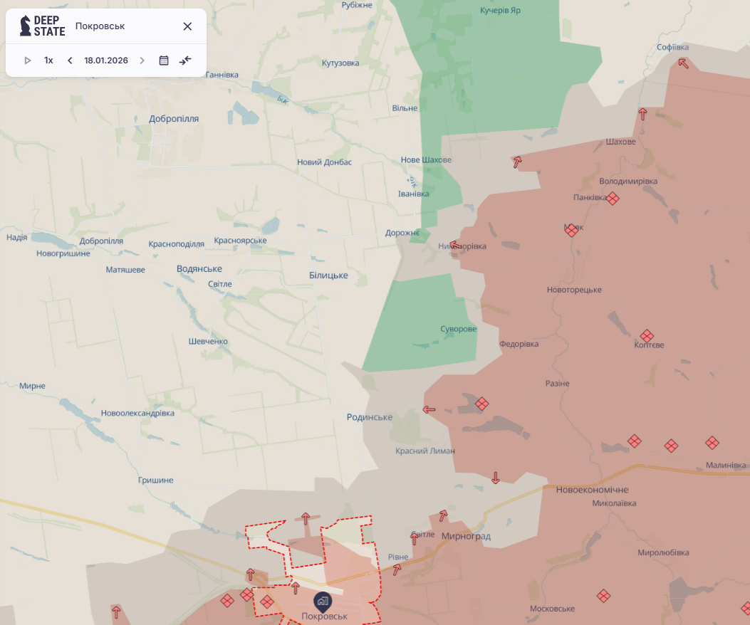 Запеклі бої точаться на півночі Покровська та Мирнограда, які ворог намагається окупувати повністю, також бої тривають на околицях міста Родинське. Минулого тижня російські війська просунулися у північній частині Покровська.
