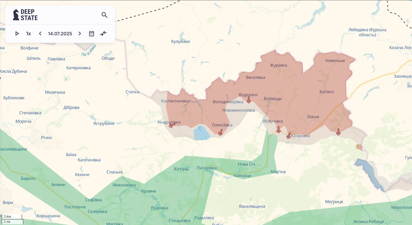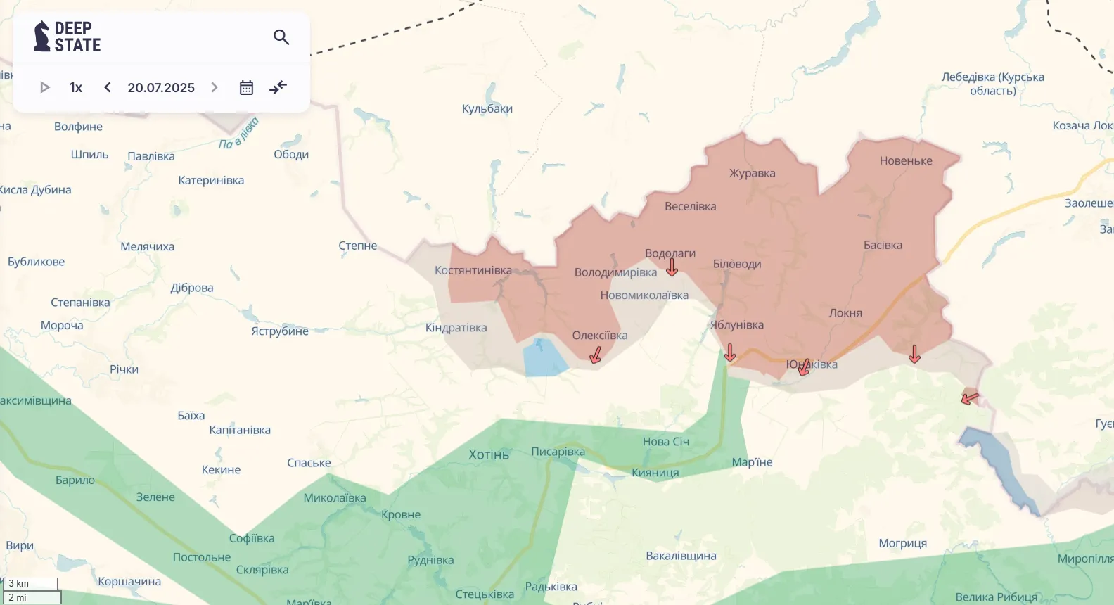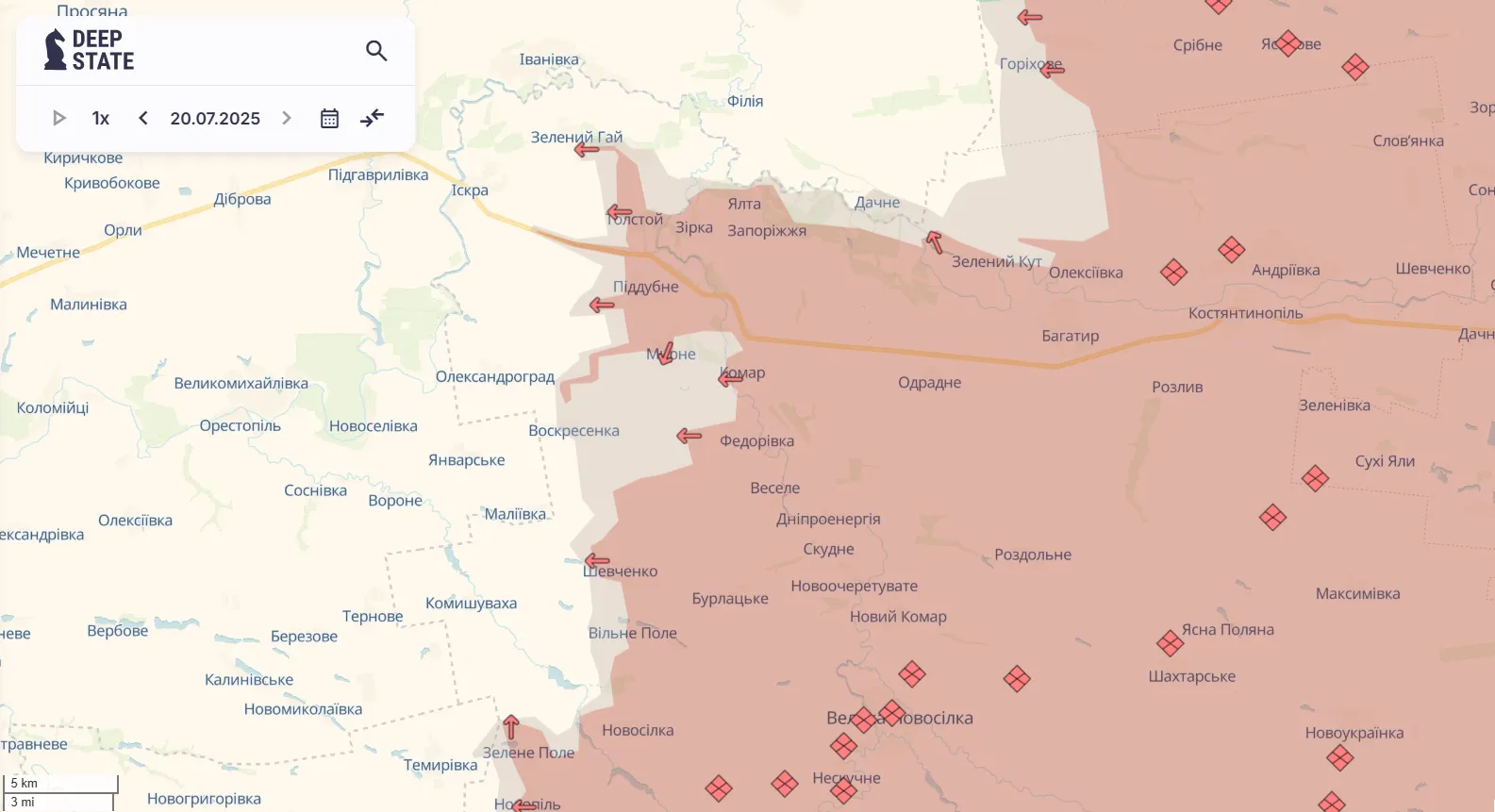 Російська армія продовжує рух в бік адмінмежі Дніпропетровської області. Ворог поступово займає посадки, села та позиції, що залишаються на шляху. Як зазначають у DeepState, під тиском противника перебуває весь відтинок від Олексіївки до Новополя.