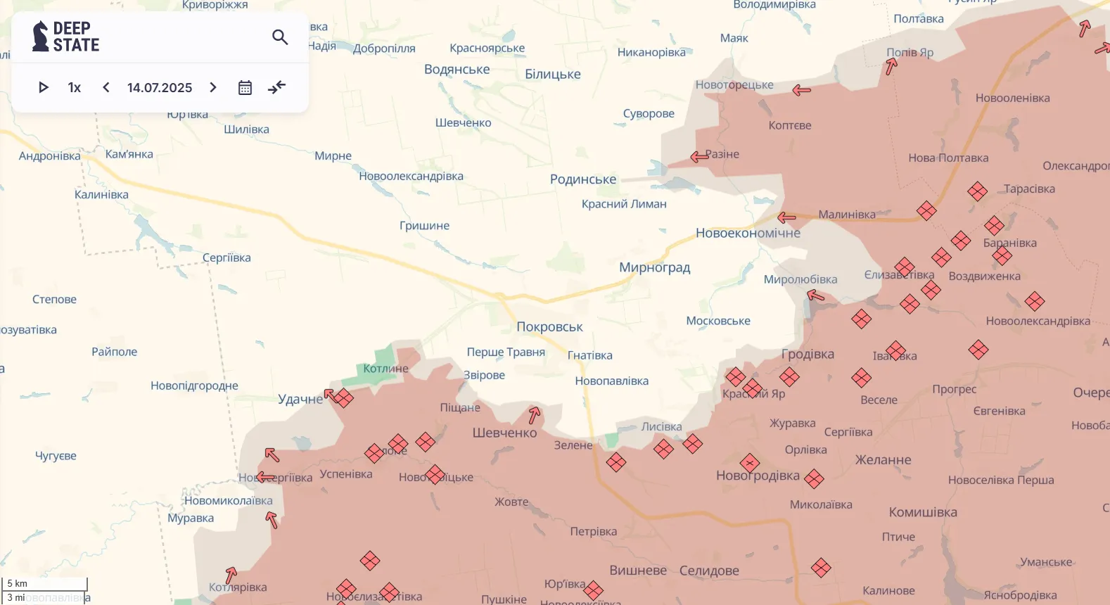 Ворог й далі кидає ресурси, аби захопити Покровськ. Протягом минулого тижня просування фіксують на всьому напрямку. Зокрема, ворог мав успіх на відтинку Котлярівка – Новосергіївка – Удачне, а також біля Піщаного і Шевченка. Крім того, після кількамісячних боїв за Багатир DeepState повідомили про окупацію населеного пункту.