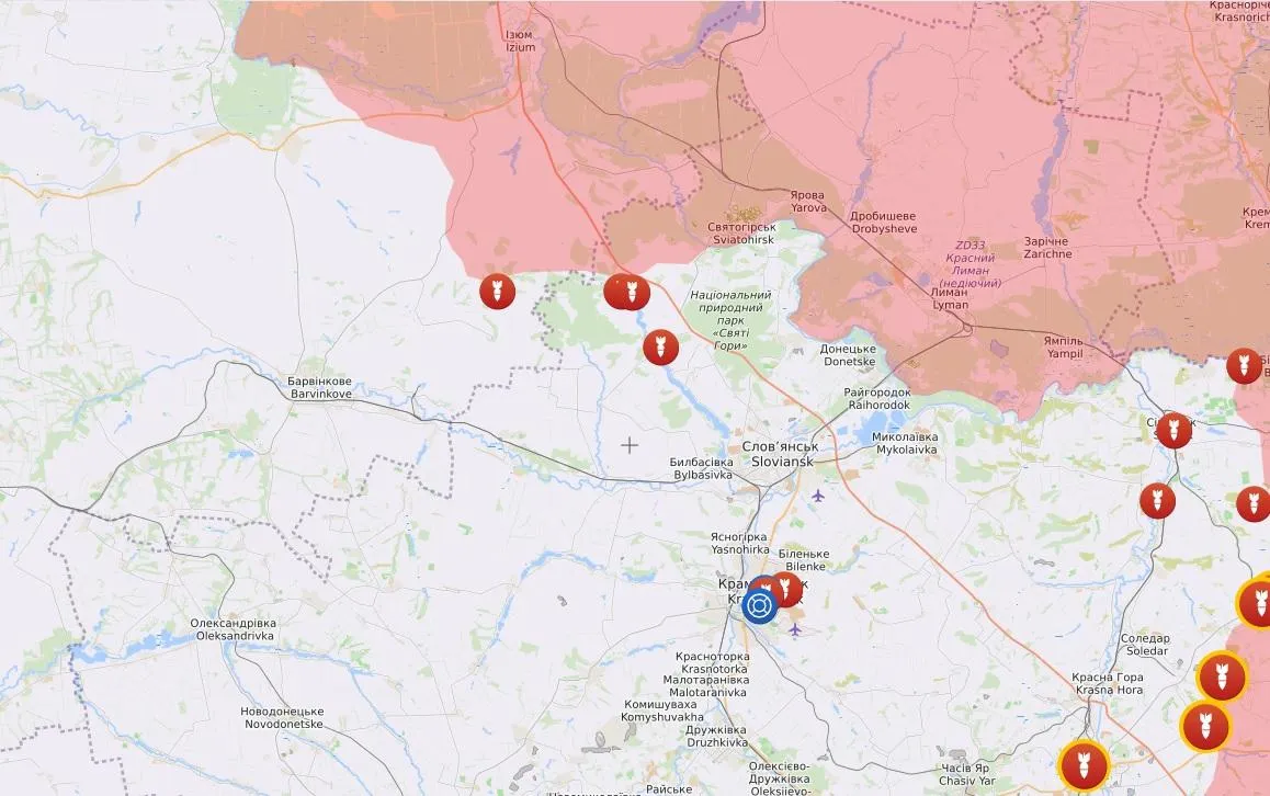 Артилерійські обстріли на Слов'янському напрямку / Скриншот Liveuamap