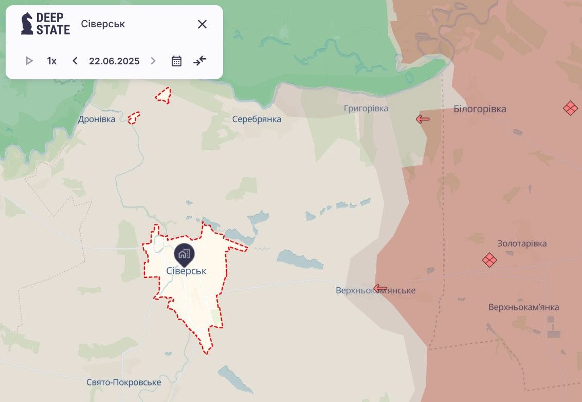 Західна околиця Білогорівки залишається у сірій зоні, відповідно, на адмінмежі росіяни остаточно не вийшли. Водночас ворог атакував у напрямку Верхньокамянського Донецької області та, на жаль, закріпився в селі. Відстань від лінії фронту до Сіверська становить 6 кілометрів. Захоплення міста дозволить росіянам наступати на Слов'янськ та Краматорськ.