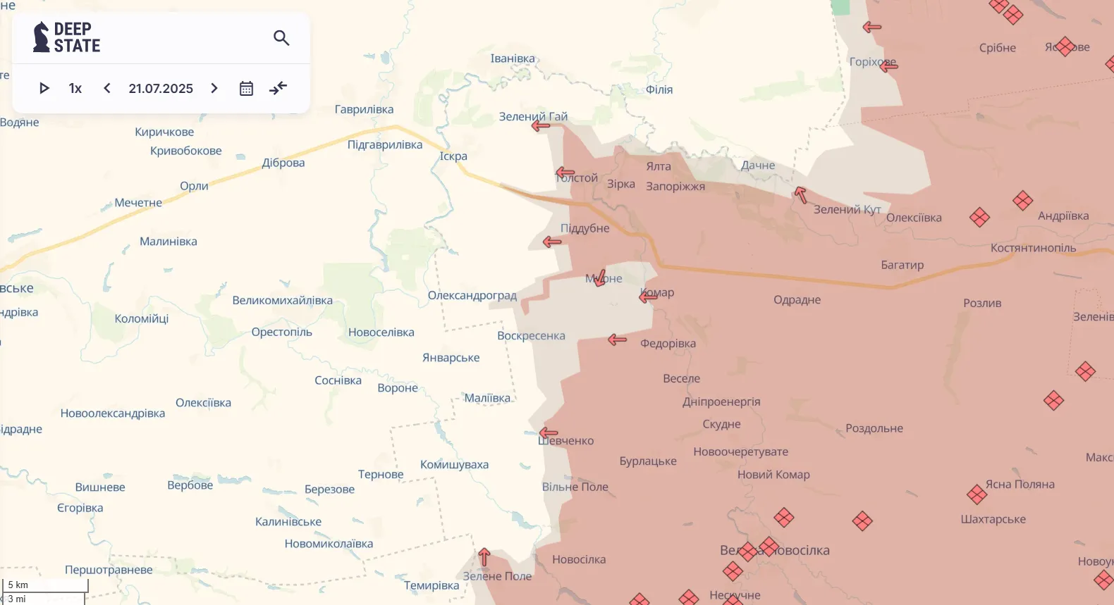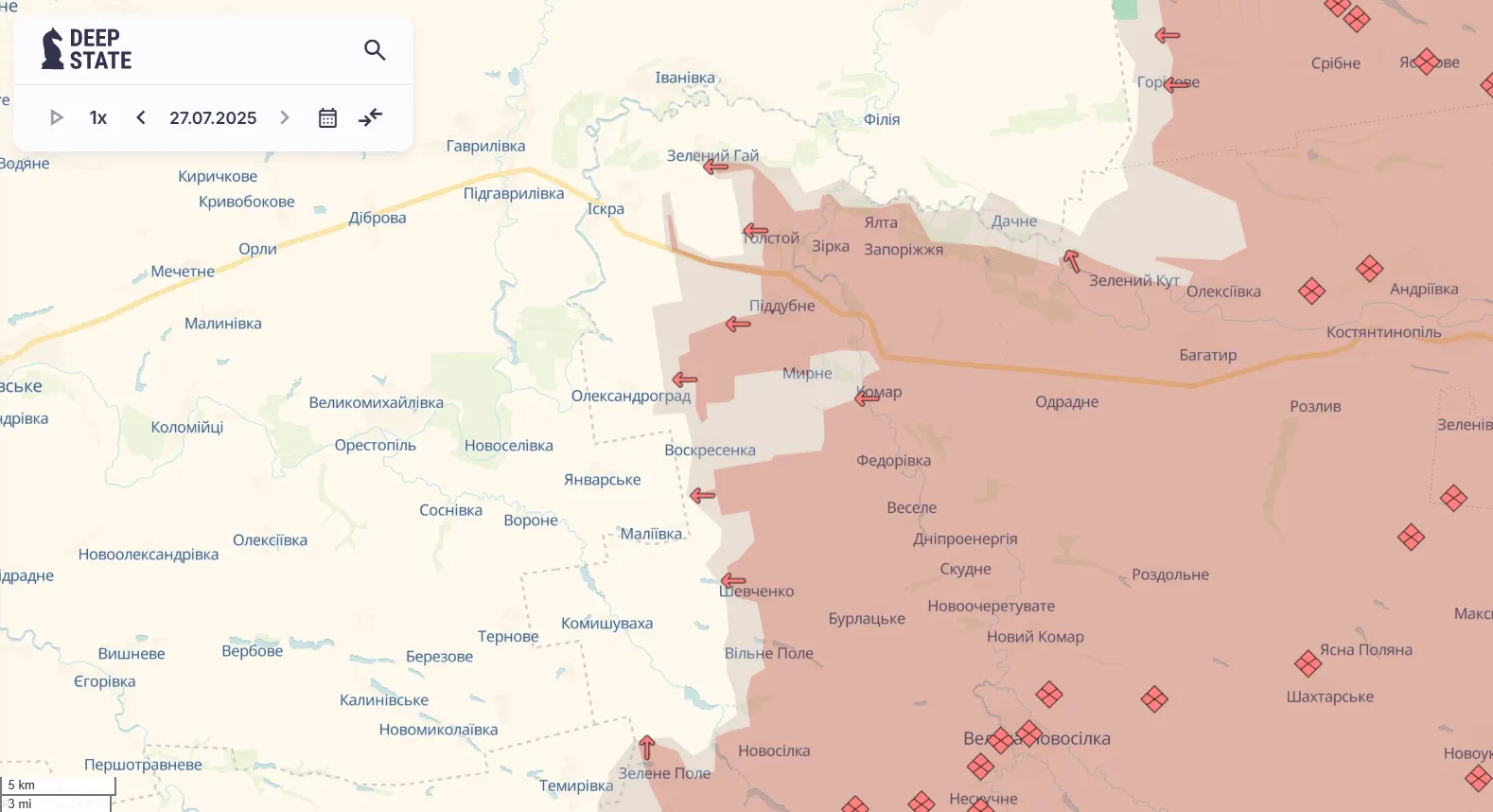 Російська армія продовжує метр за метром просуватися на Новопавлівському напрямку у бік кордону з Дніпропетровською областю. Наразі ворог не закріпився у жодному населеному пункті Дніпропетровщини, проте за останній тиждень він мав низку нових просувань біля адмінмежі.