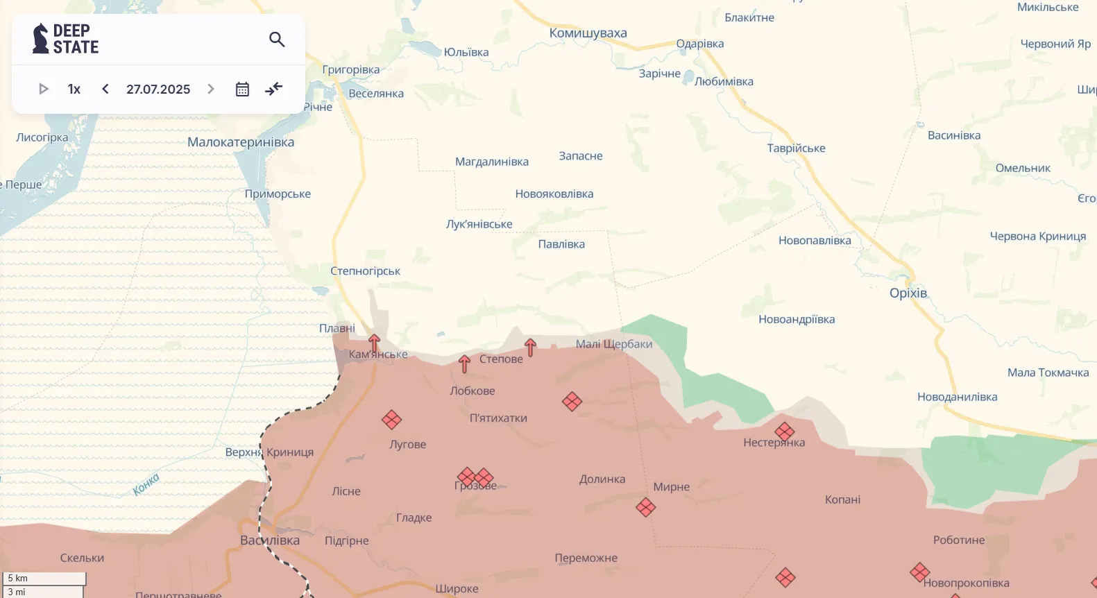 Ворог продовжує тиснути по всьому відтинку від Плавнів аж до Щербаків. Особливо критичною є ситуація біля Кам'янського, де окупанти змогли просунутися та закріпитися. Наразі ворог намагається дозачистити населений пункт, а паралельно розвиває ініціативу далі – у напрямку Плавнів та Степногірська.