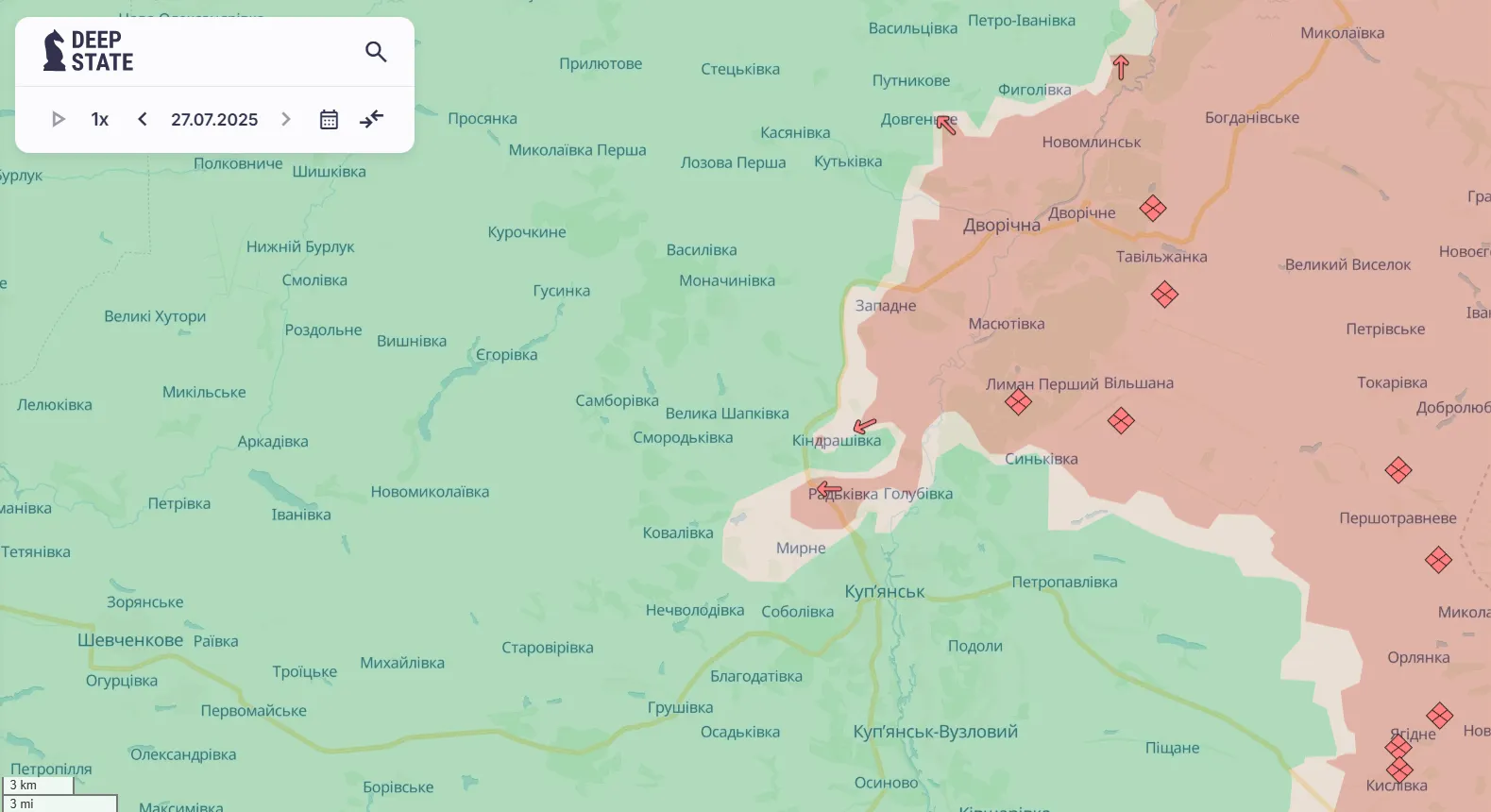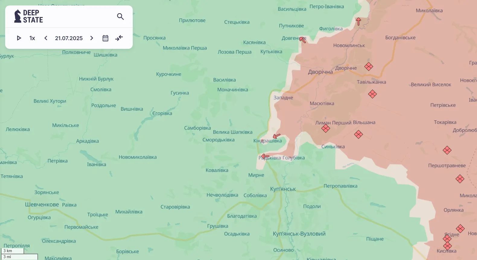 На жаль, російській армії вдалося просунутися безпосередньо біля Куп'янська. Окупанти прагнуть увійти до міста з північного заходу. Червона зона вже впритул наблизилася до околиць. Штурмові групи ворога здійснюють спроби закріпитися по дорозі з Радьківки біля АЗС та з Голубівки в бік приватного сектору.