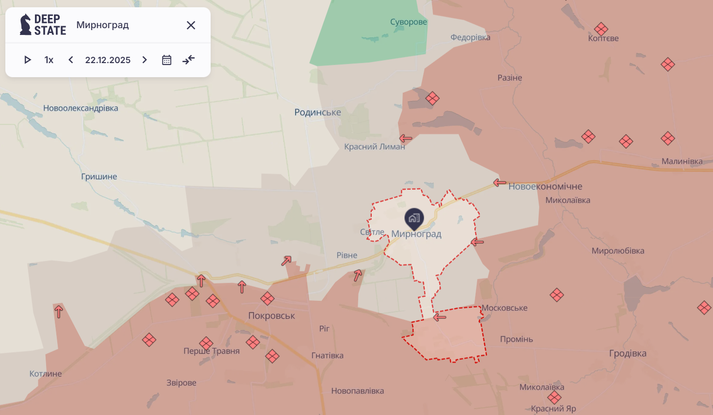 Покровськ і Мирноград залишаються головними епіцентрами бойових зіткнень. Минулого тижня ворог просунувся на західній околиці Покровська і в Мирнограді. Ворог захопив більшість міста. Зараз фактично лінія фронту фіксується в районі траси на Павлоград.