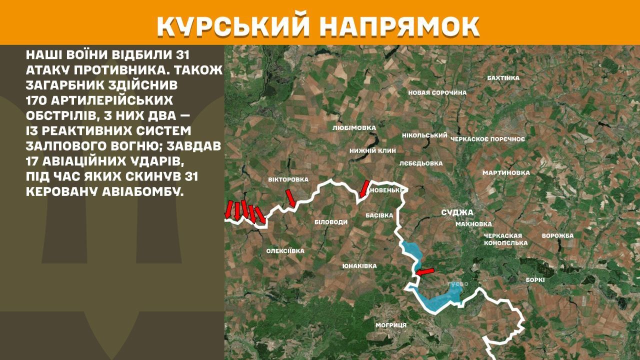 На Курському – наші захисники відбили 31 атаку ворога. Російські загарбники здійснили 170 артилерійських обстрілів, із них 2 – з реактивних систем залпового вогню. Ворог завдав 17 авіаційних ударів, під час яких скинув 31 керовану авіабомбу.