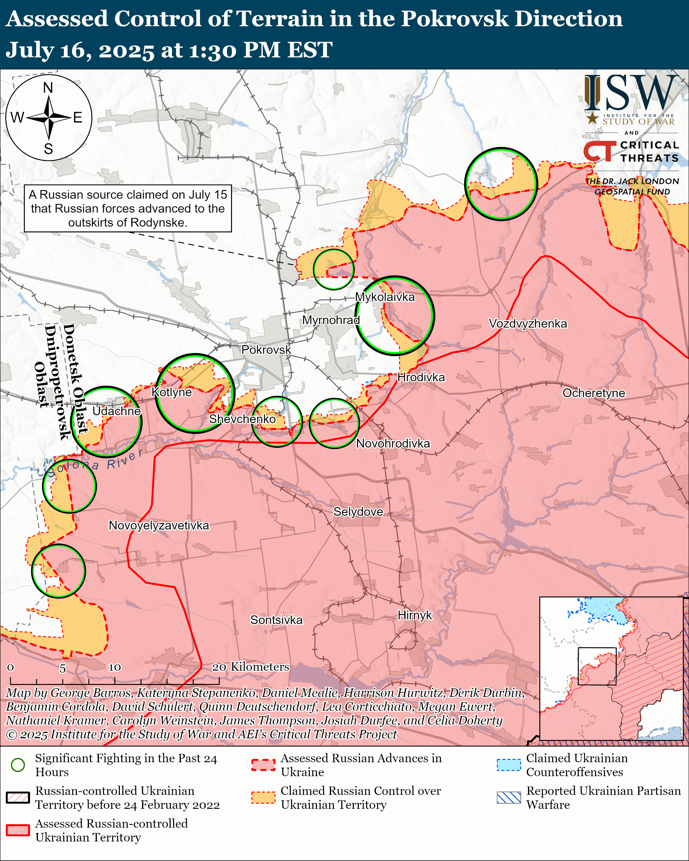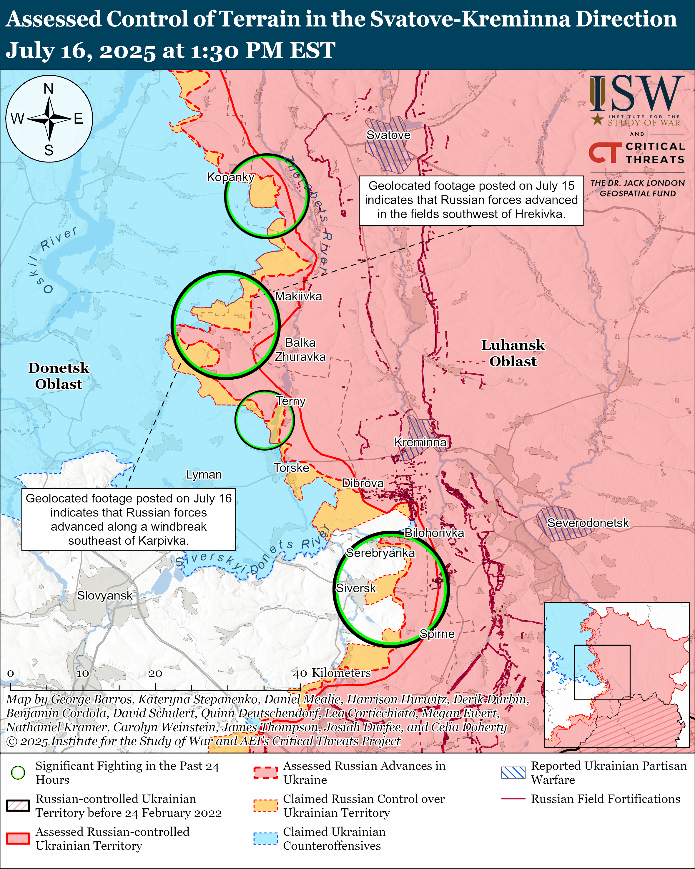 - Росіяни також мали успіхи на Лиманському напрямку. Геолокаційні кадри, опубліковані 16 липня, свідчать, що російські війська нещодавно просунулися на південний схід від Карпівки.