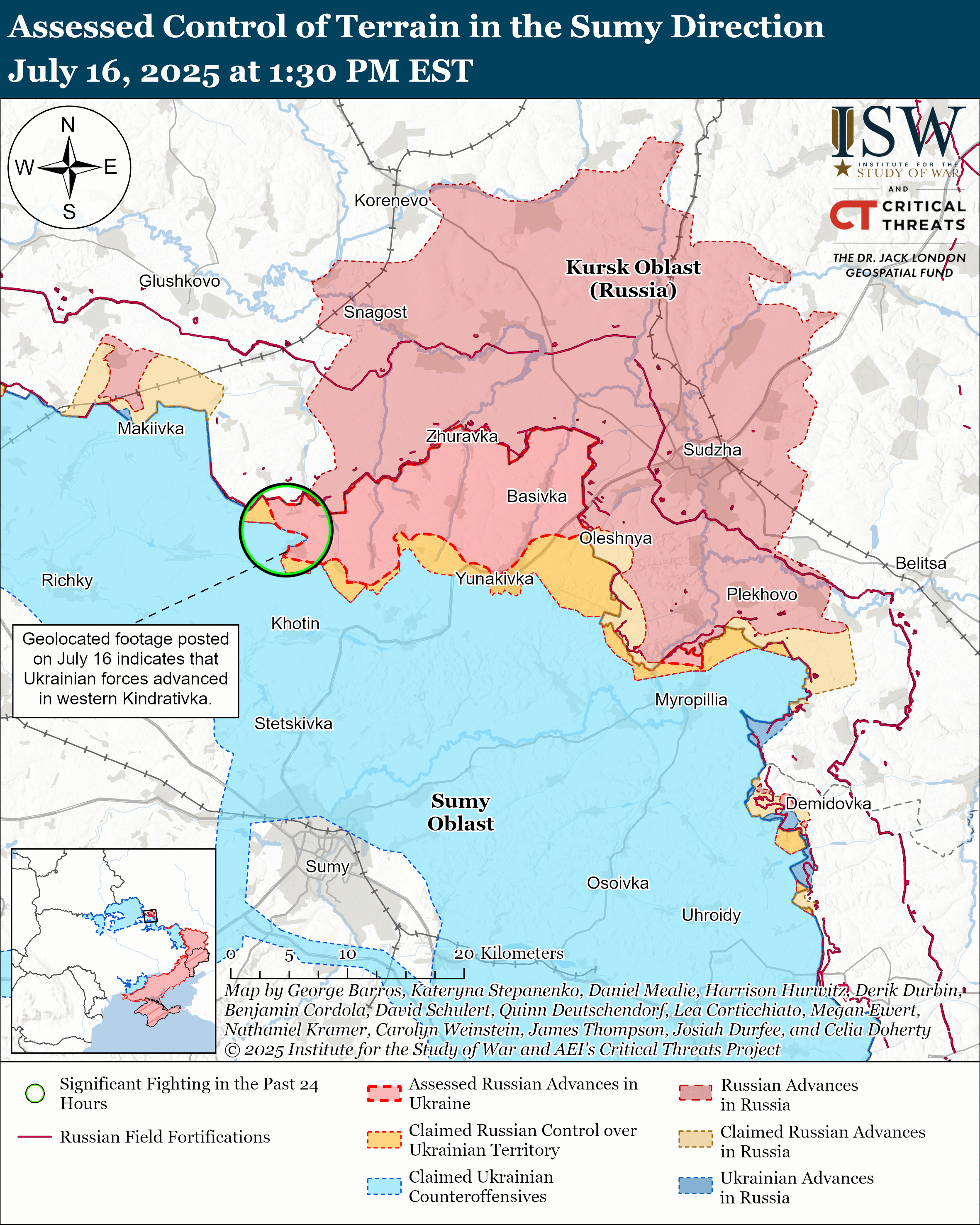 - Українські війська нещодавно просунулися на півночі Сумської області. Геолокаційні відеозаписи, опубліковані 16 липня, свідчать, що українські війська нещодавно просунулися біля Кіндратівки.