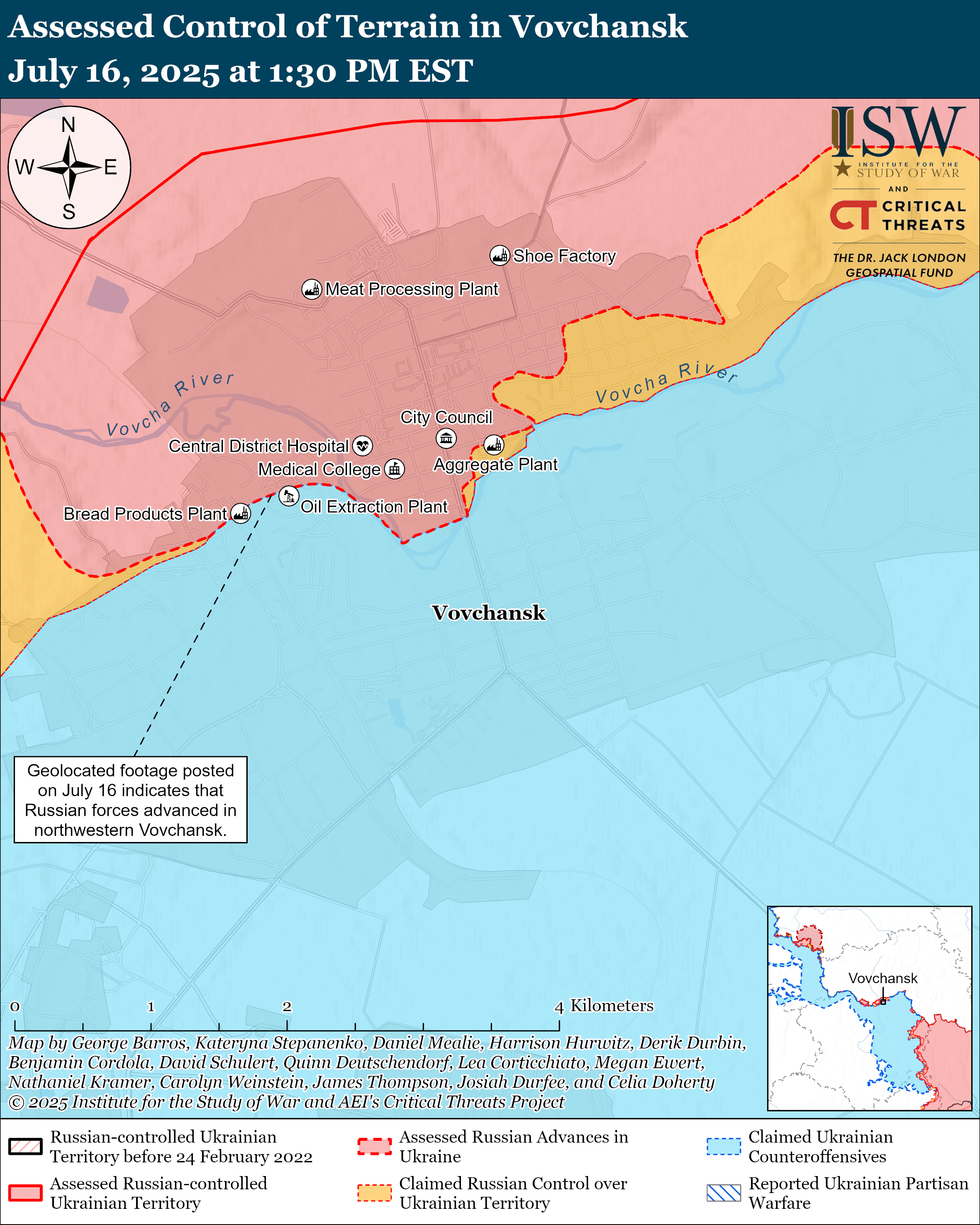 - Російська армія нещодавно просунулася на півночі Харківської області. Геолокаційні кадри, опубліковані 16 липня, свідчать, що російські війська нещодавно просунулися в районі олійноекстракційного заводу в північній частині Вовчанська та в лісистій місцевості на північний захід від цього міста.