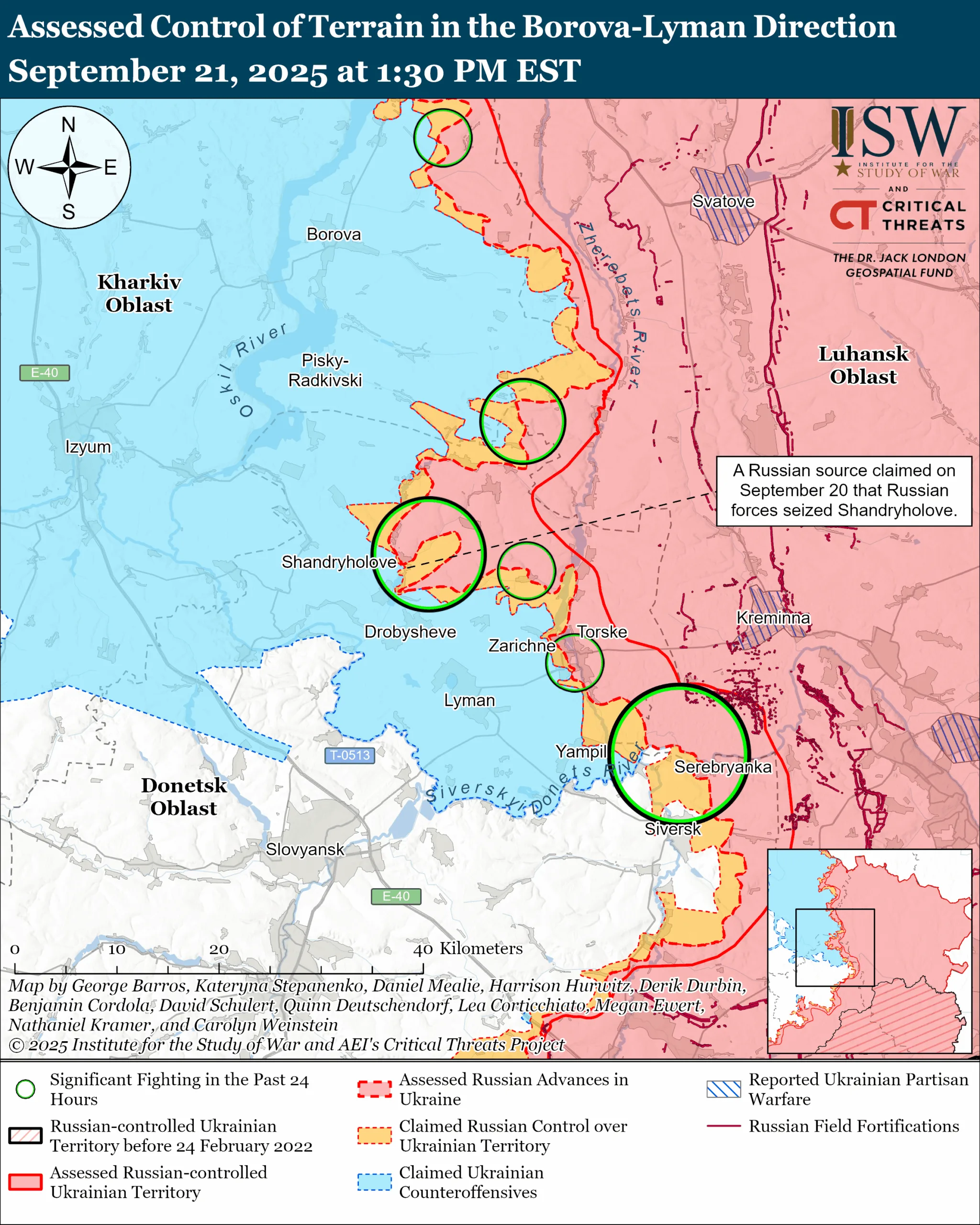 - Росіяни продовжили наступальні операції на Лиманському напрямку, але підтвердженого прогресу не досягли. 20 та 21 вересня російські війська атакували поблизу Шандриголового, Дерилового та Новоселівки та у напрямку Дробишева, біля Новомихайлівки, Нового Миру, у напрямку Ставок, поблизу Колодязів, Торського, Ямполя та в районі Серебрянського лісництва.