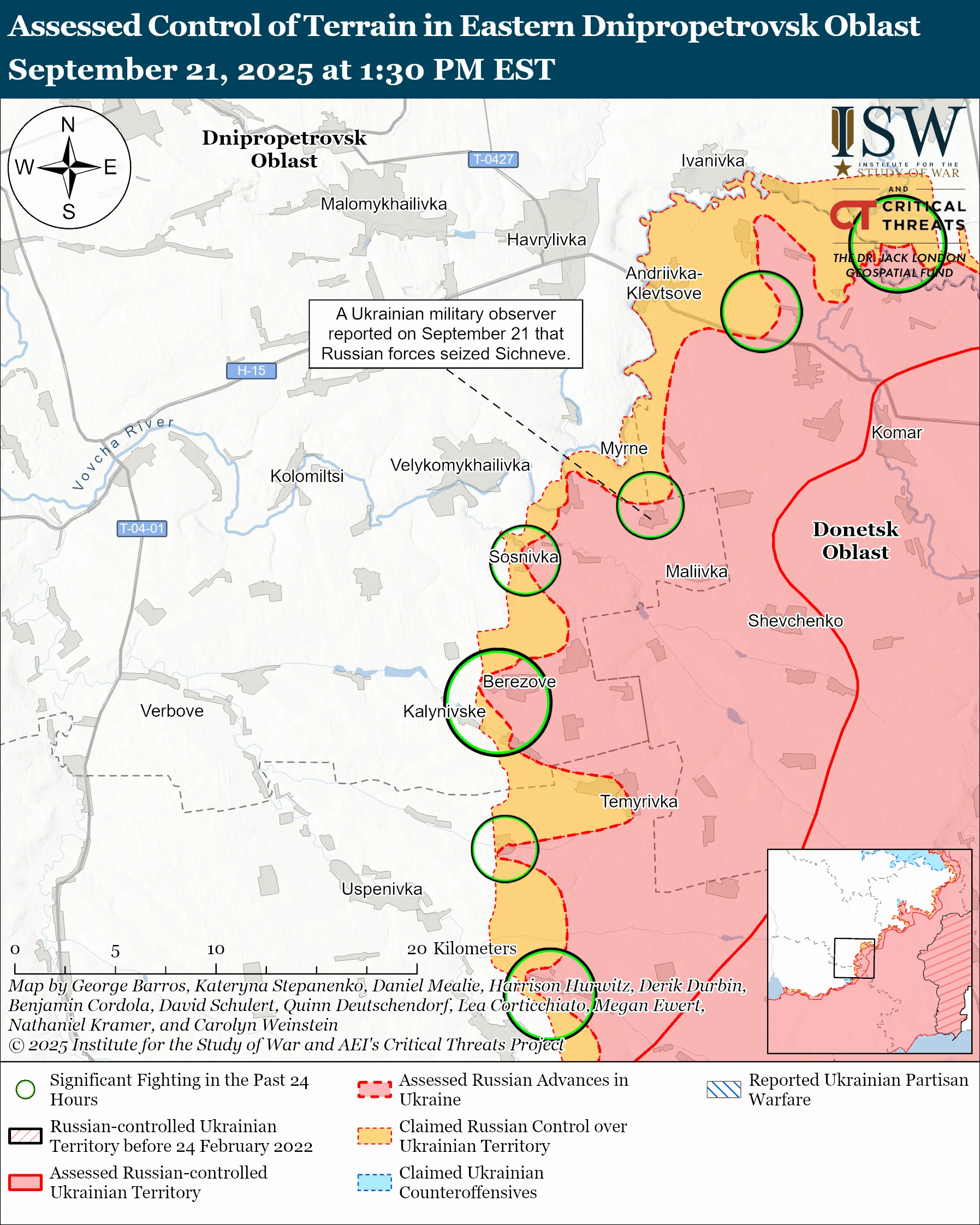 - 21 вересня російські війська продовжили наступальні операції в тактичному районі Добропілля, але не просунулися вперед.