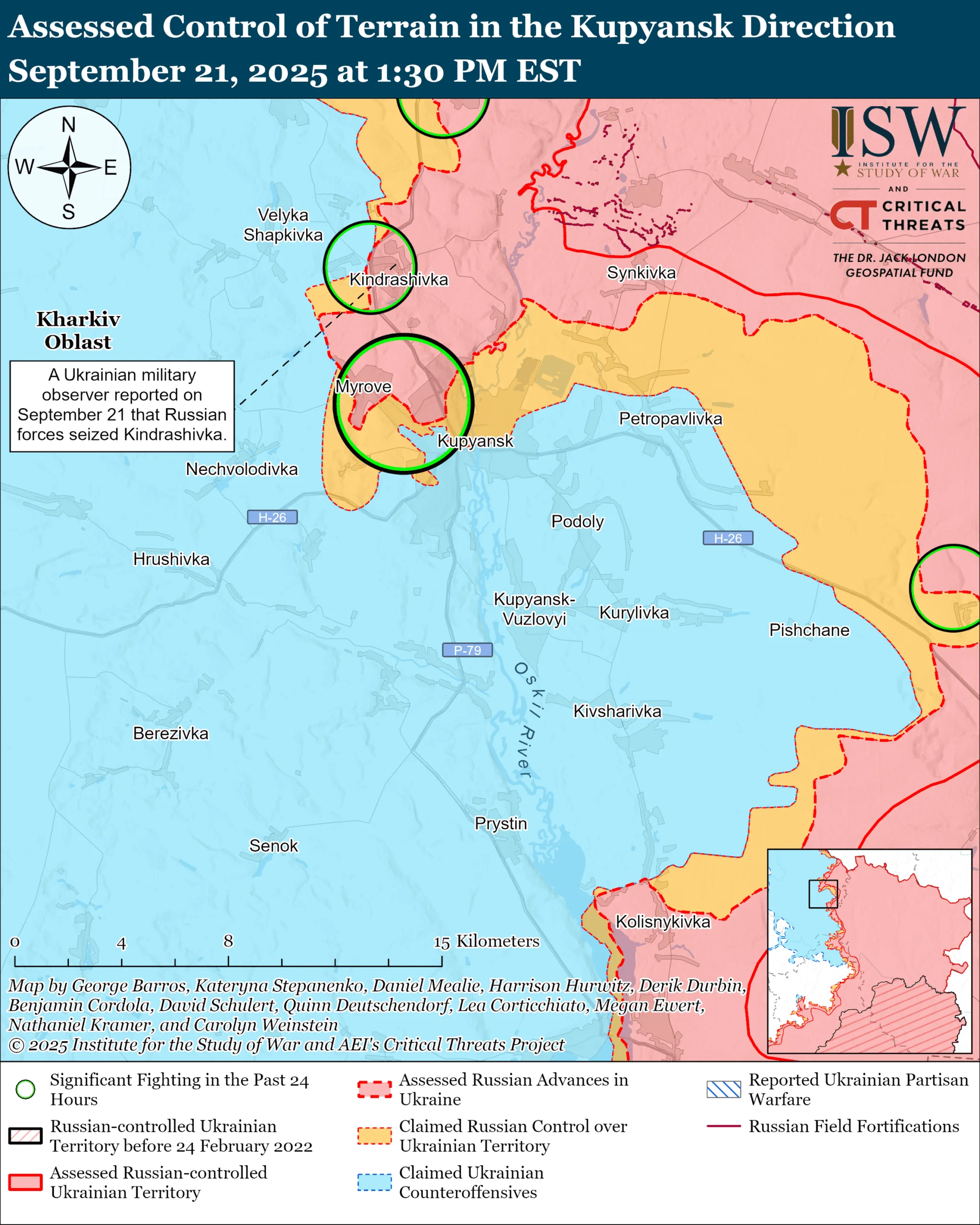 - Загарбники нещодавно просунулися на Куп'янському напрямку. Російські війська, ймовірно, захопили Кіндрашівку, що на північ від Куп'янська.