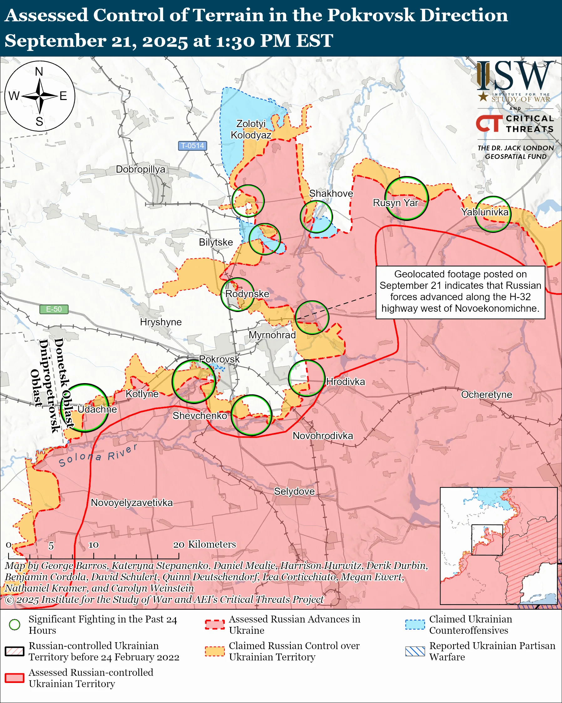 - Росіяни нещодавно просунулися на Покровському напрямку. Геолокаційні відеозаписи, опубліковані 21 вересня, свідчать, що російські війська нещодавно просунулися на захід від Новоекономічного вздовж автомагістралі Т-0504 Костянтинівка – Покровськ.