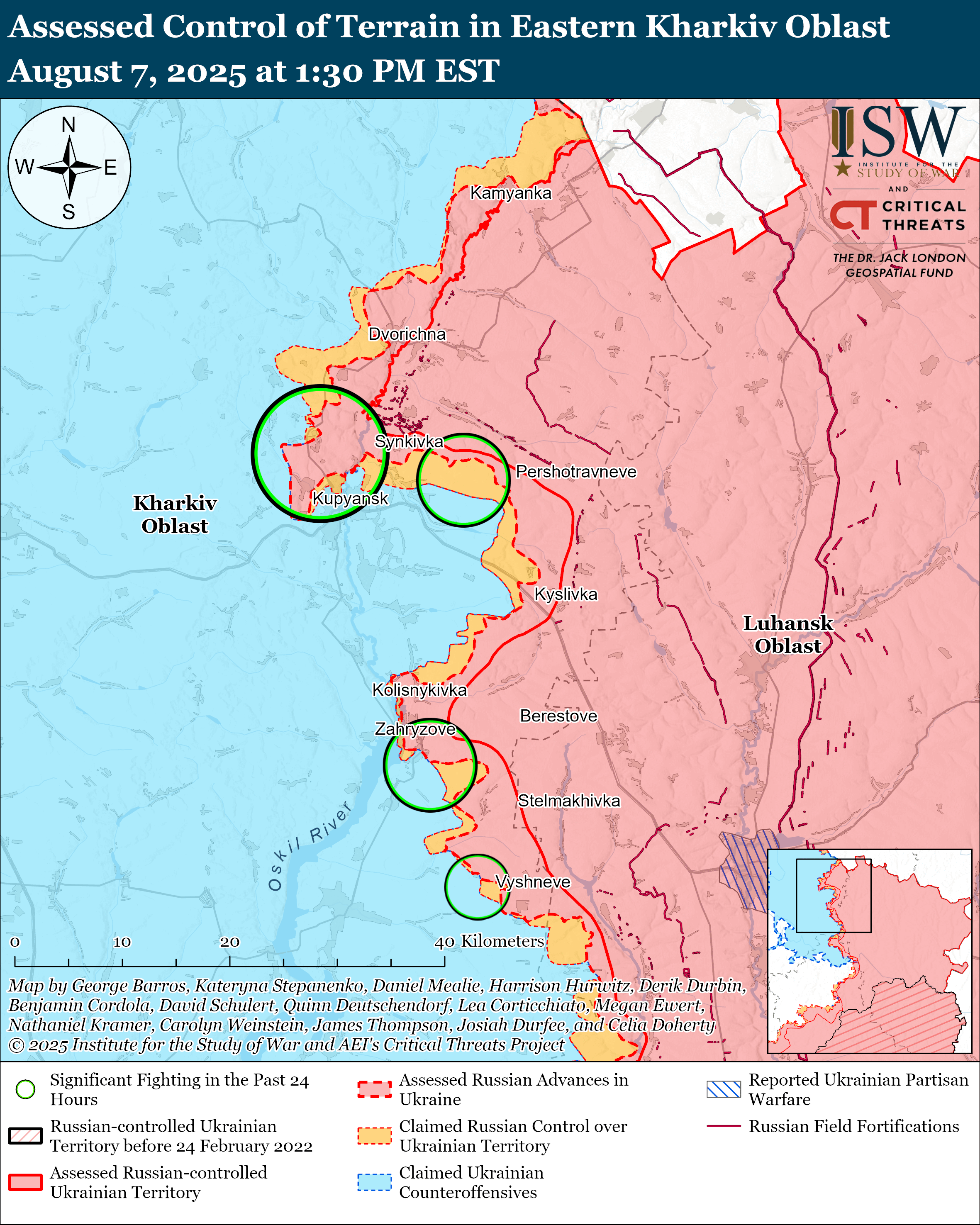 - 7 серпня російські війська продовжили наступальні операції на півночі Сумської та Харківської областей, але підтвердженого прогресу не досягли. Та сама ситуація на Куп'янському та Боровському напрямку.