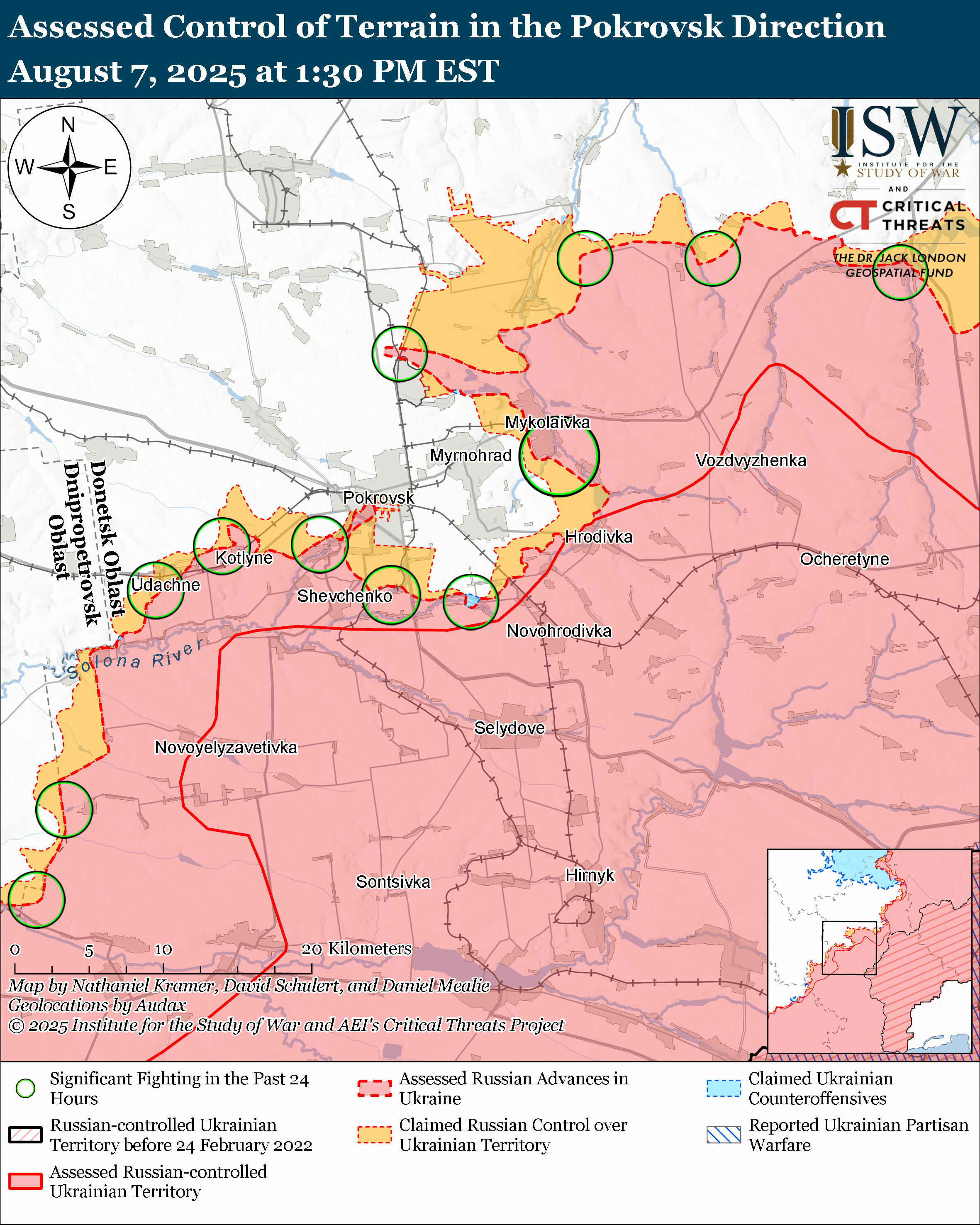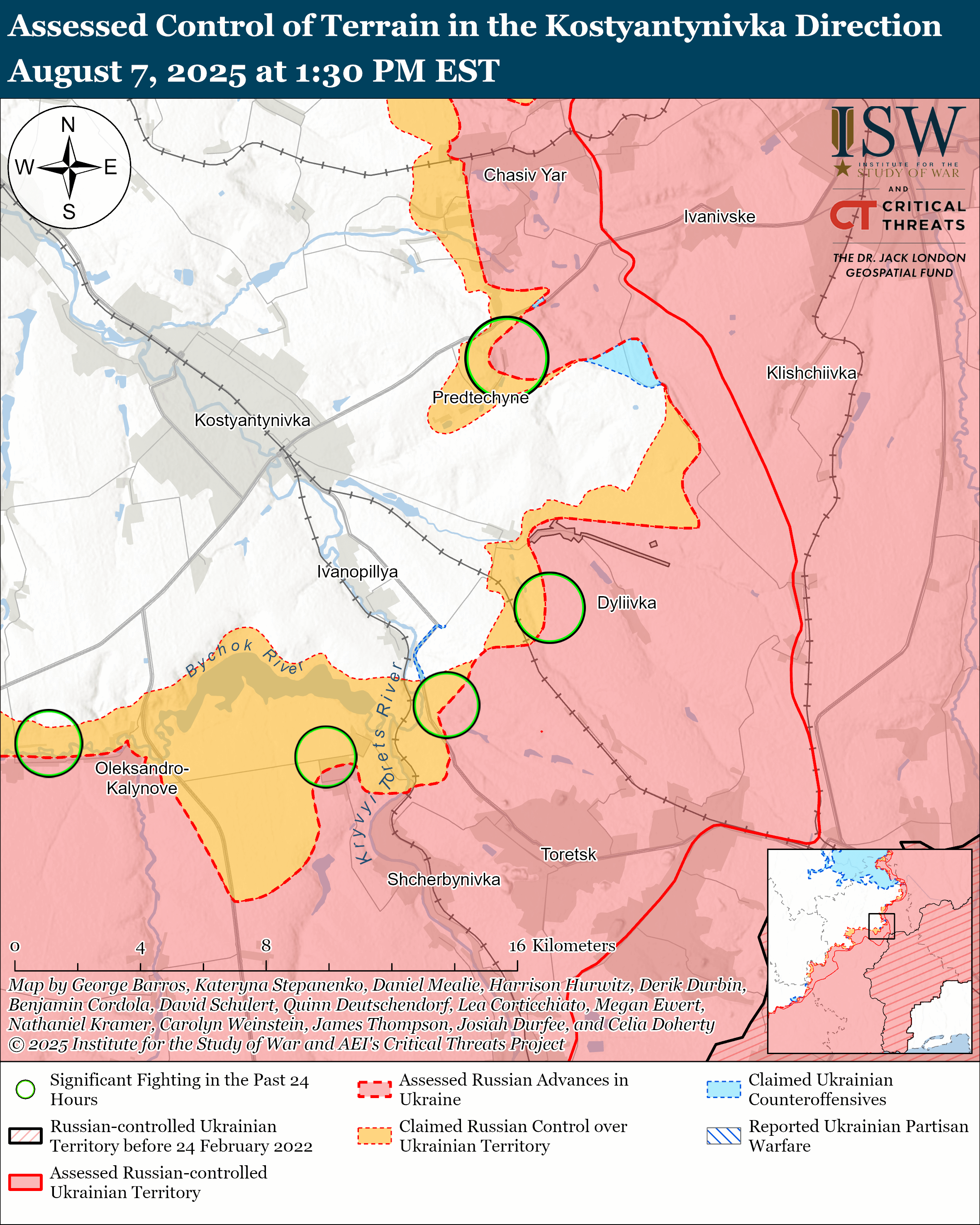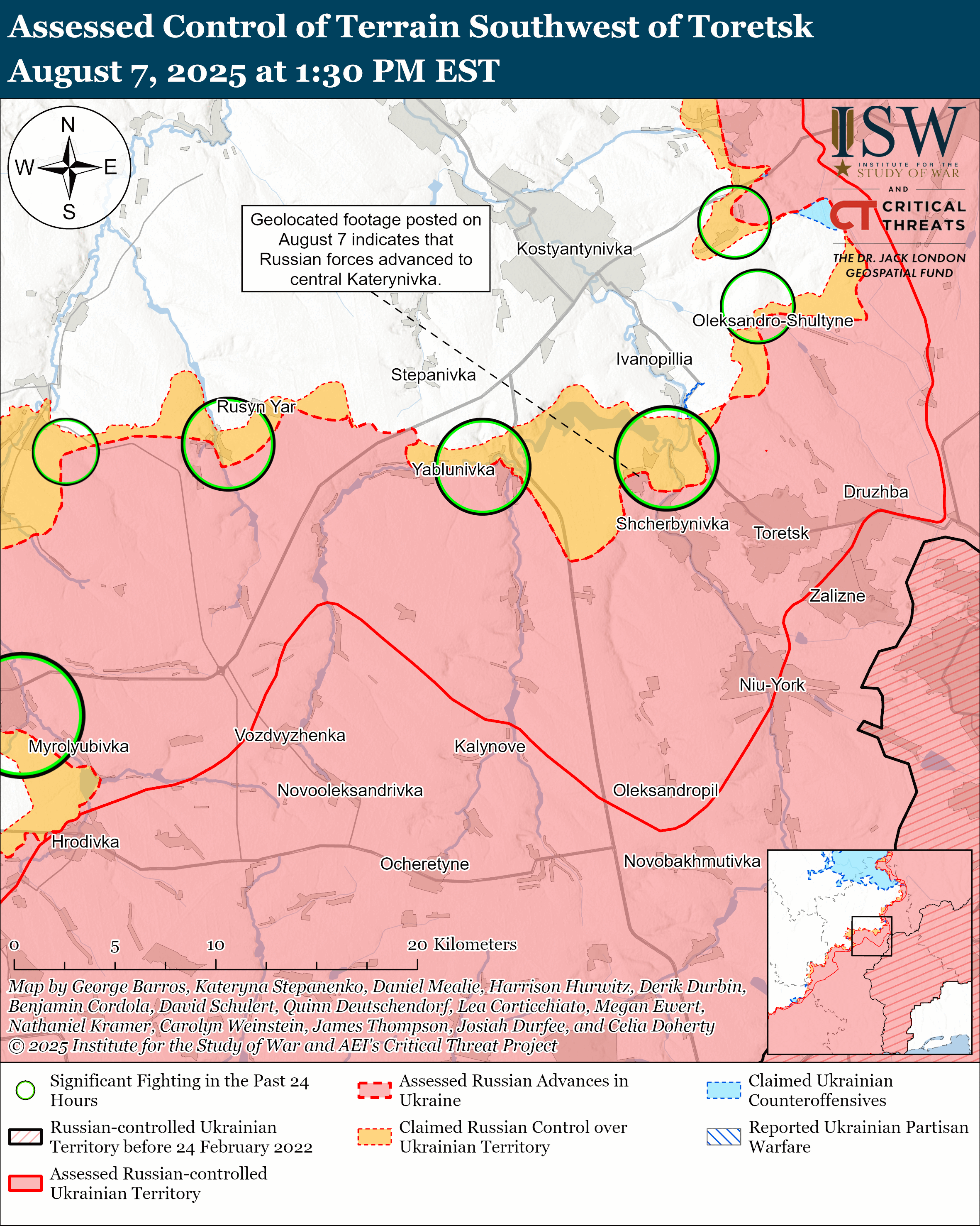 - Однак окупантам вдалося просунутися на Торецькому напрямку. Геолокаційні відеозаписи, опубліковані 7 серпня, свідчать про те, що під час посиленого механізованого штурму розміром з роту російські війська просунулися до центральної Катеринівки (безпосередньо на північний захід від Торецька) та центральної Щербинівки. Російські війська, ймовірно, нещодавно завершили захоплення Торецька.