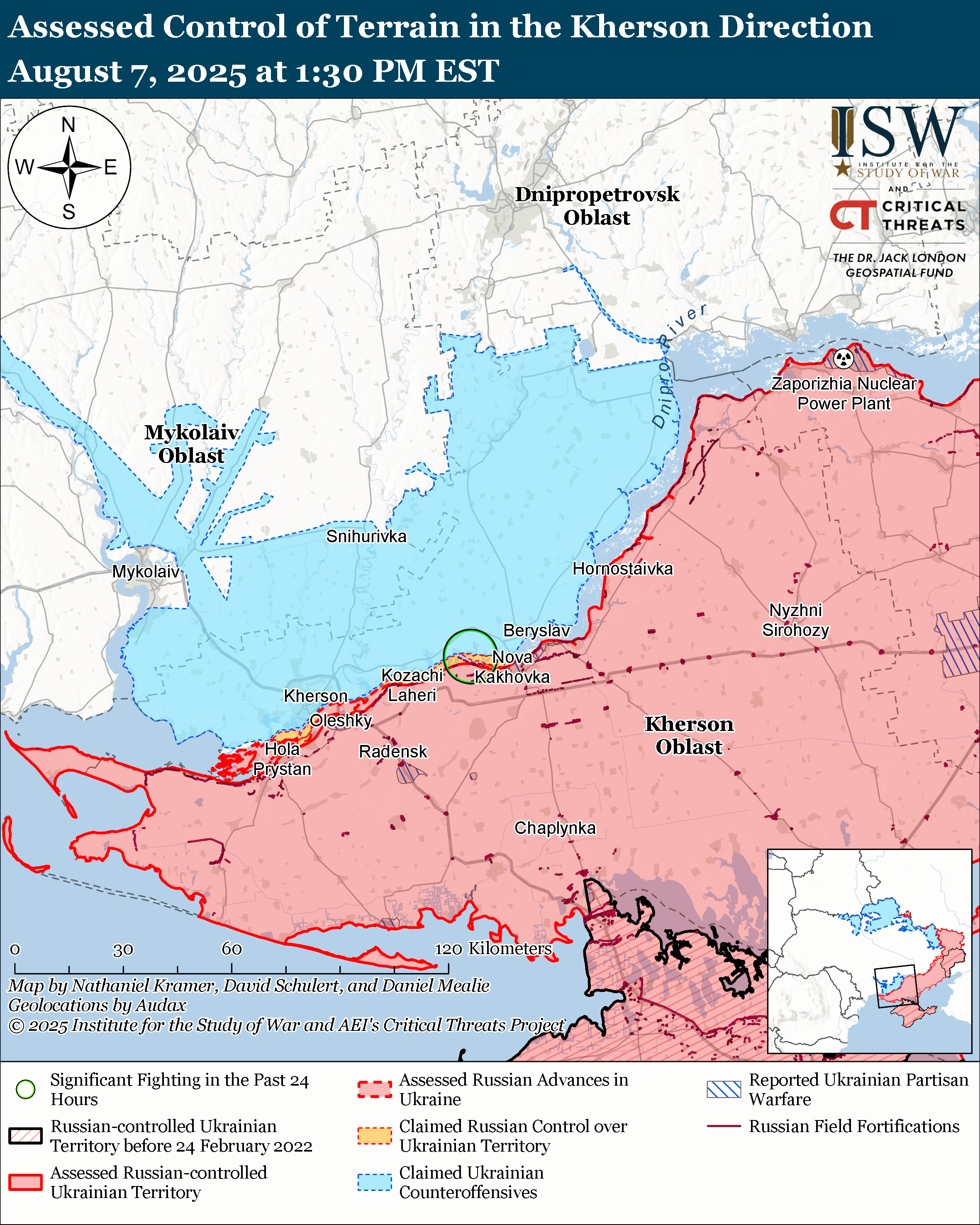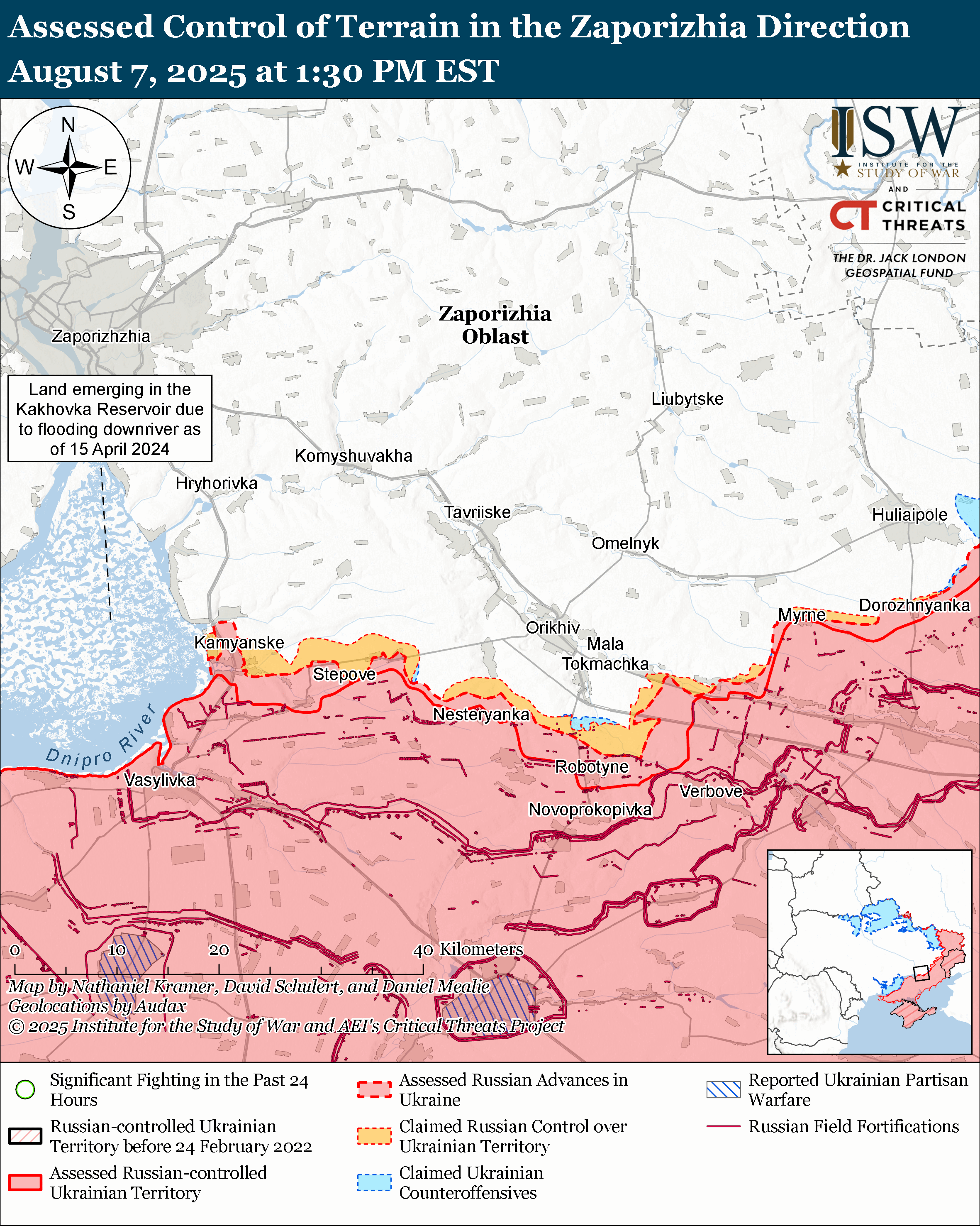 - 7 серпня про наземну активність на сході Запорізької області не повідомляли ні українські, ні російські джерела. На заході Запоріжжя та Херсонському напрямку штурми продовжилися, але без успіху для окупантів.