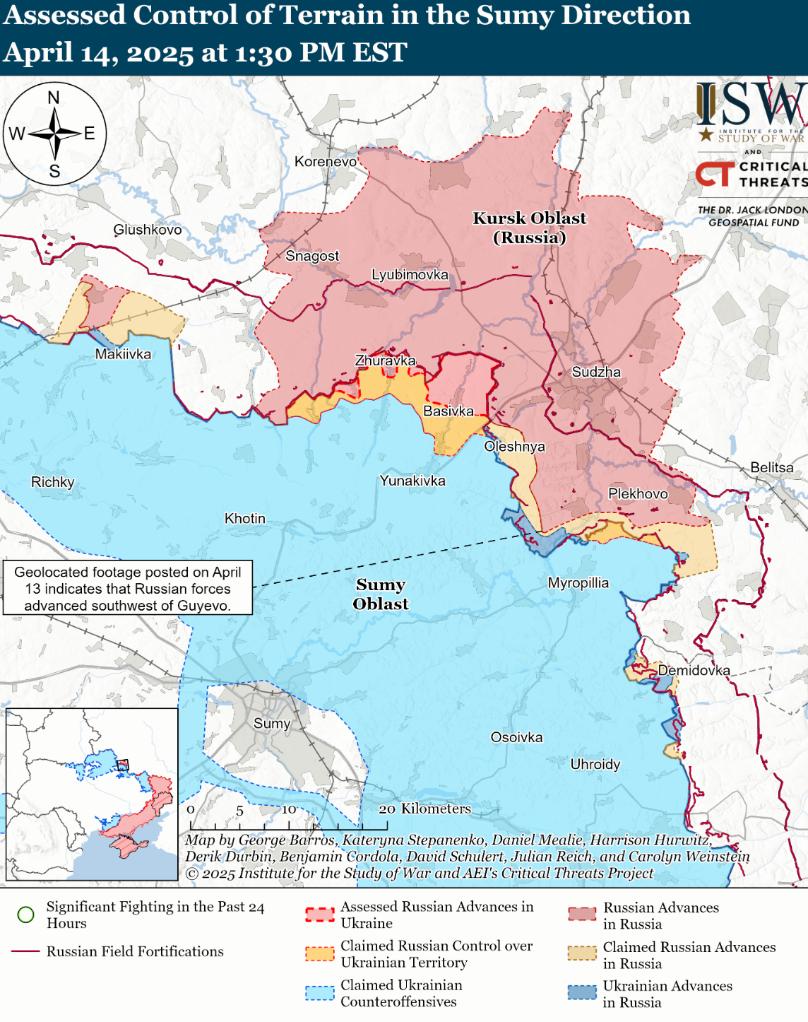 - Російські сили нещодавно просунулися на Курщині. Геолокаційні кадри, опубліковані 13 квітня, показують, що ворожі війська нещодавно просунулися на південний захід від поселення Гуєво (на південь від Суджі).
