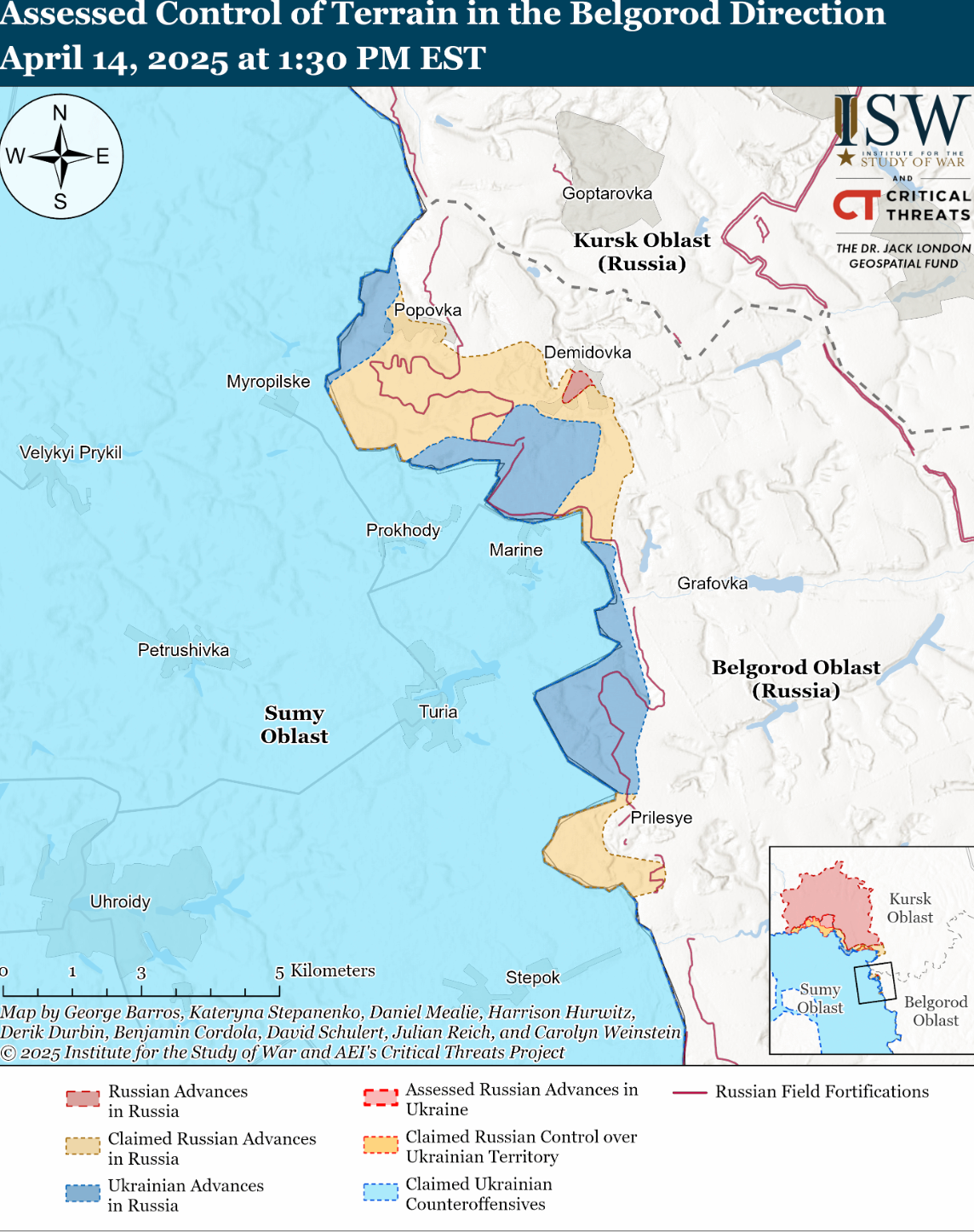 - В понеділок, 14 квітня, на північному заході Бєлгородської області тривали бої, але російські війська не підтвердили наступ.
