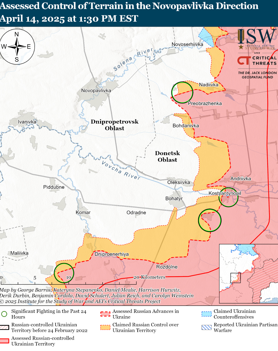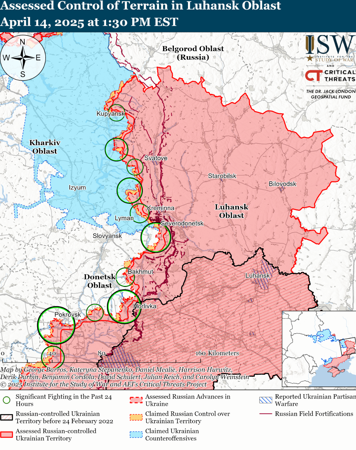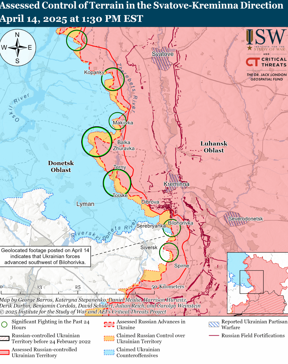 - Російська армія 14 квітня продовжували наступальні дії на Лиманському напрямку, але не підтвердили наступ.
