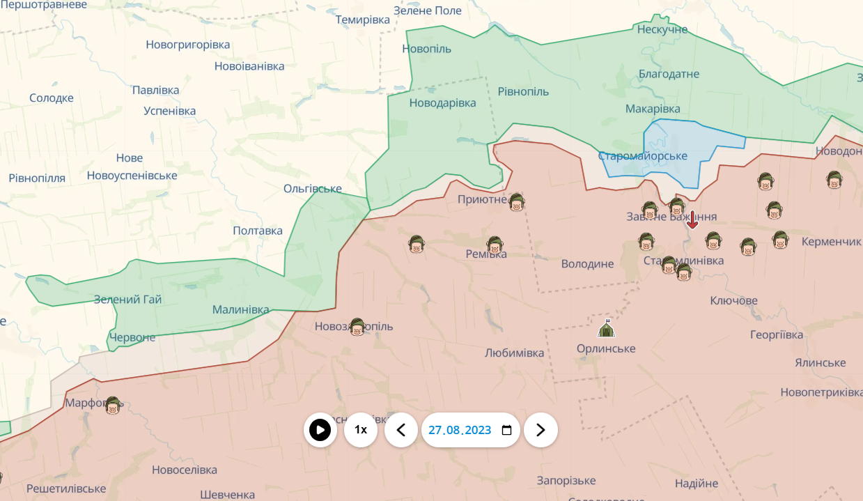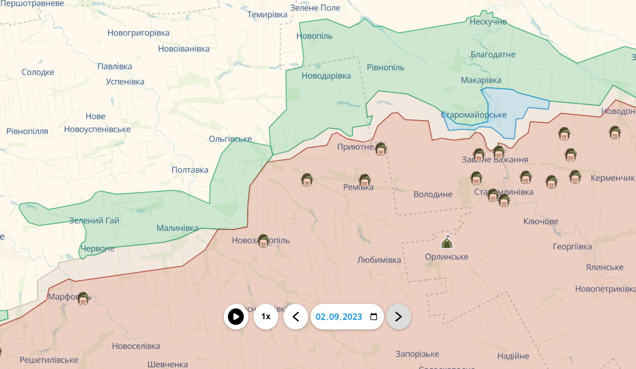 Так само помітні очевидні зміни на лінії фронту поблизу Приютного, що на межі Запорізької та Донецької областей. Там відбувся такий собі "зріз" українського та ворожого "клинів". Втім, DeepState уточнює, що зміни відбулися ще на початку серпня, але раніше їх не можна було вносити.