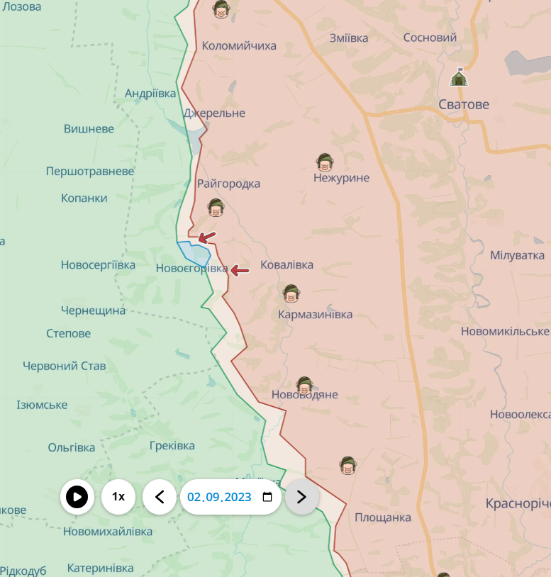 Доволі складною залишається ситуація на Сватівському напрямку. Тут вже не перший тиждень росіяни прагнуть покращити своє становище біля Новоєгорівки, яку вони змогли ненадовго захопити, але одразу ж втратили ще в липні 2023 року.