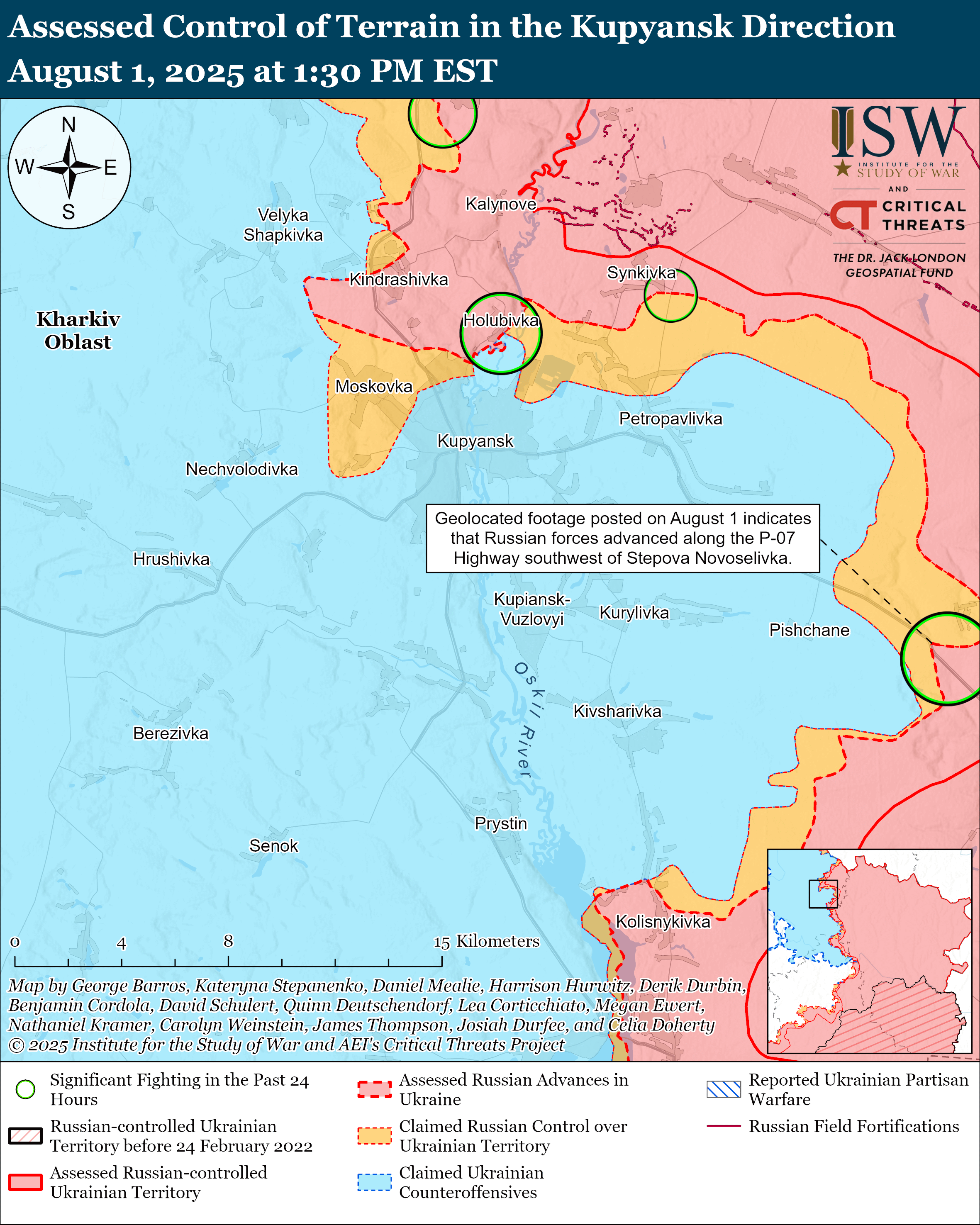 - Росіяни просунулися на Куп'янському напрямку. Геолокаційні відео, опубліковані 1 серпня, свідчать, що російські війська нещодавно просунулися вздовж траси Р-07 Куп'янськ – Шевченкове на південний захід від Степової Новоселівки.