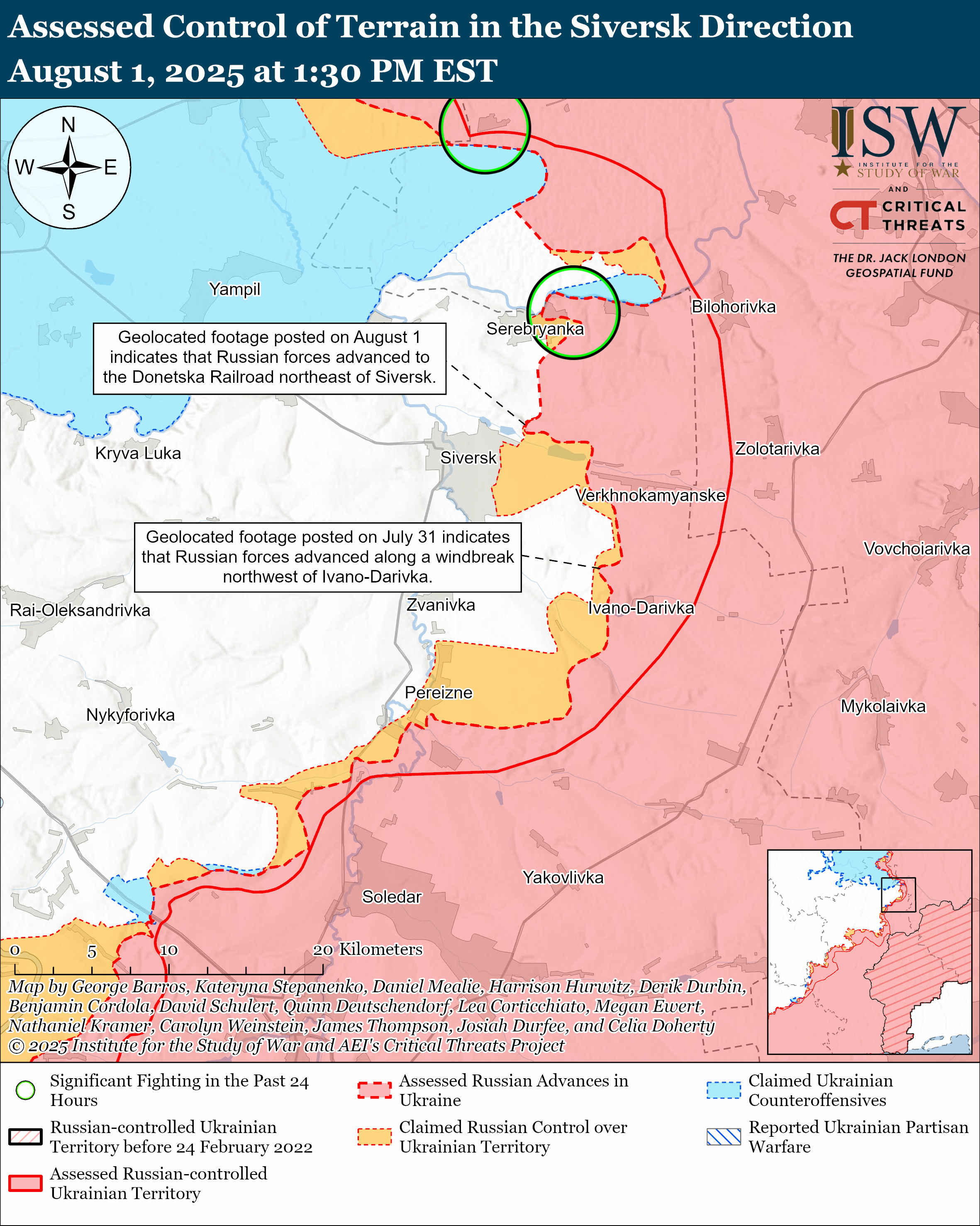 - Ворог просунувся на Сіверському напрямку. Геолокаційні відеозаписи, опубліковані 31 липня та 1 серпня, свідчать, що російські війська нещодавно просунулися поблизу Донецької залізниці на північний схід від Сіверська та на північний захід від Івано-Дар'ївки.
