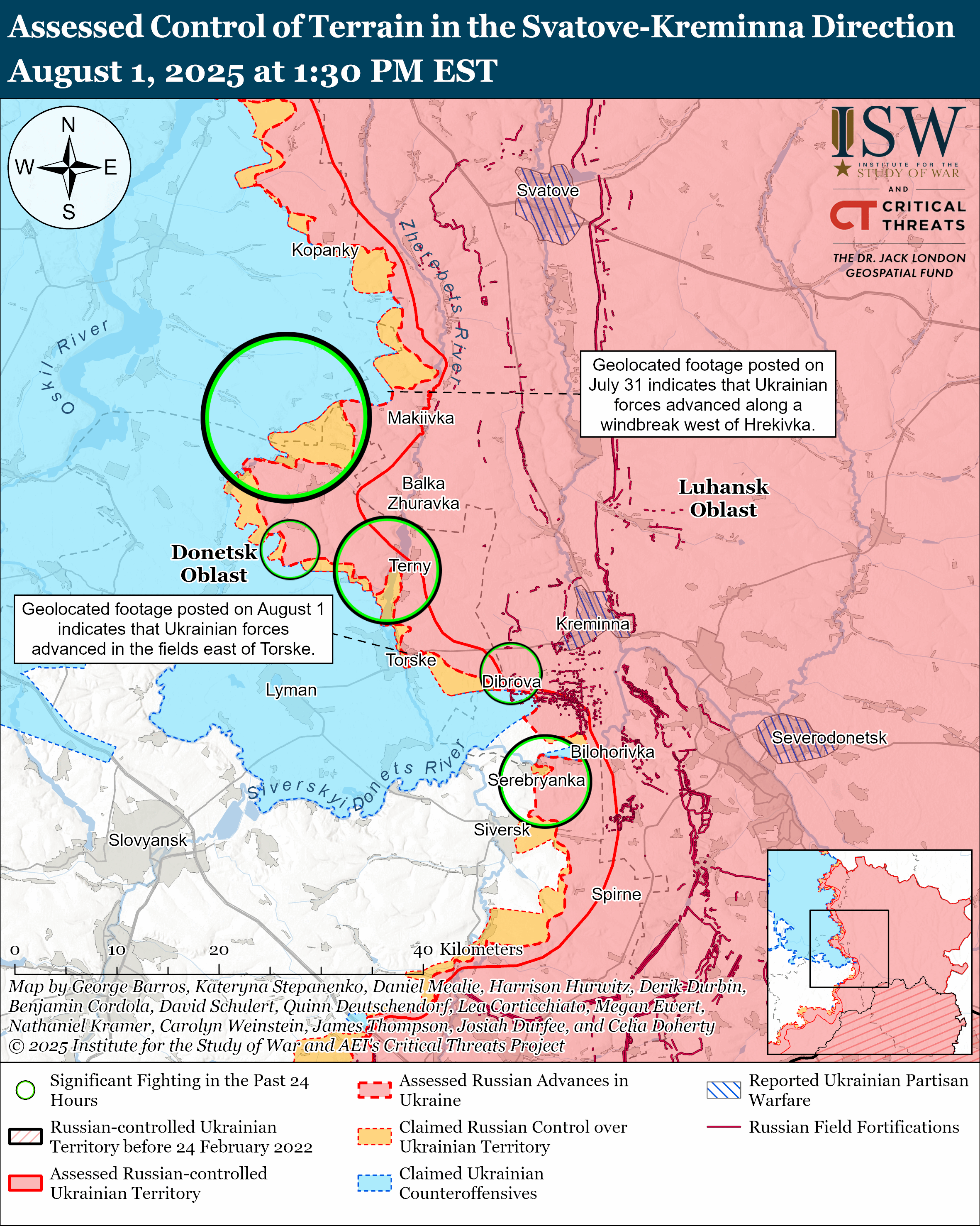 - ЗСУ просунулися у напрямку Борової. Геолокаційні кадри, опубліковані 31 липня, свідчать, що українські війська нещодавно відбили Греківку (на південний схід від Борової).