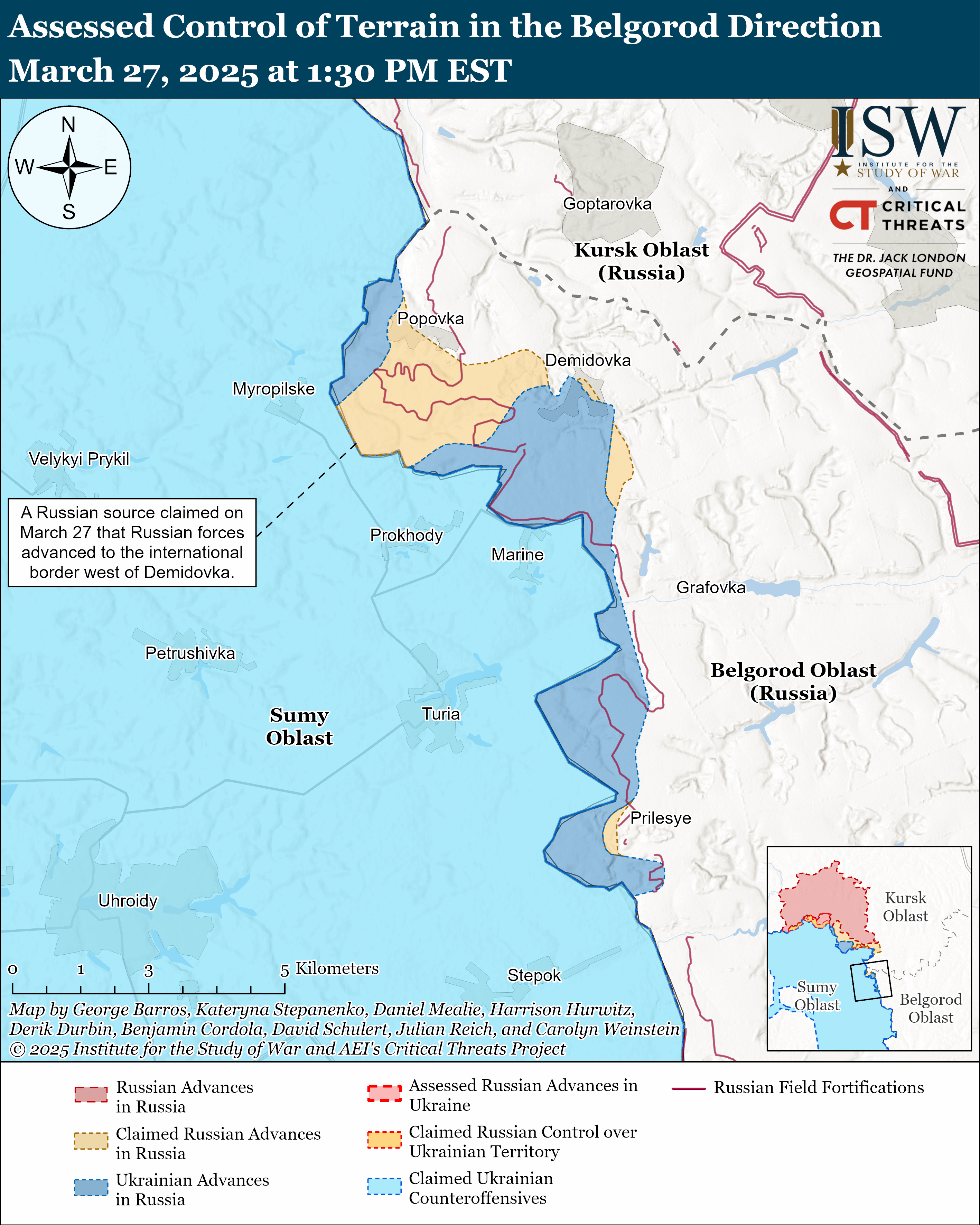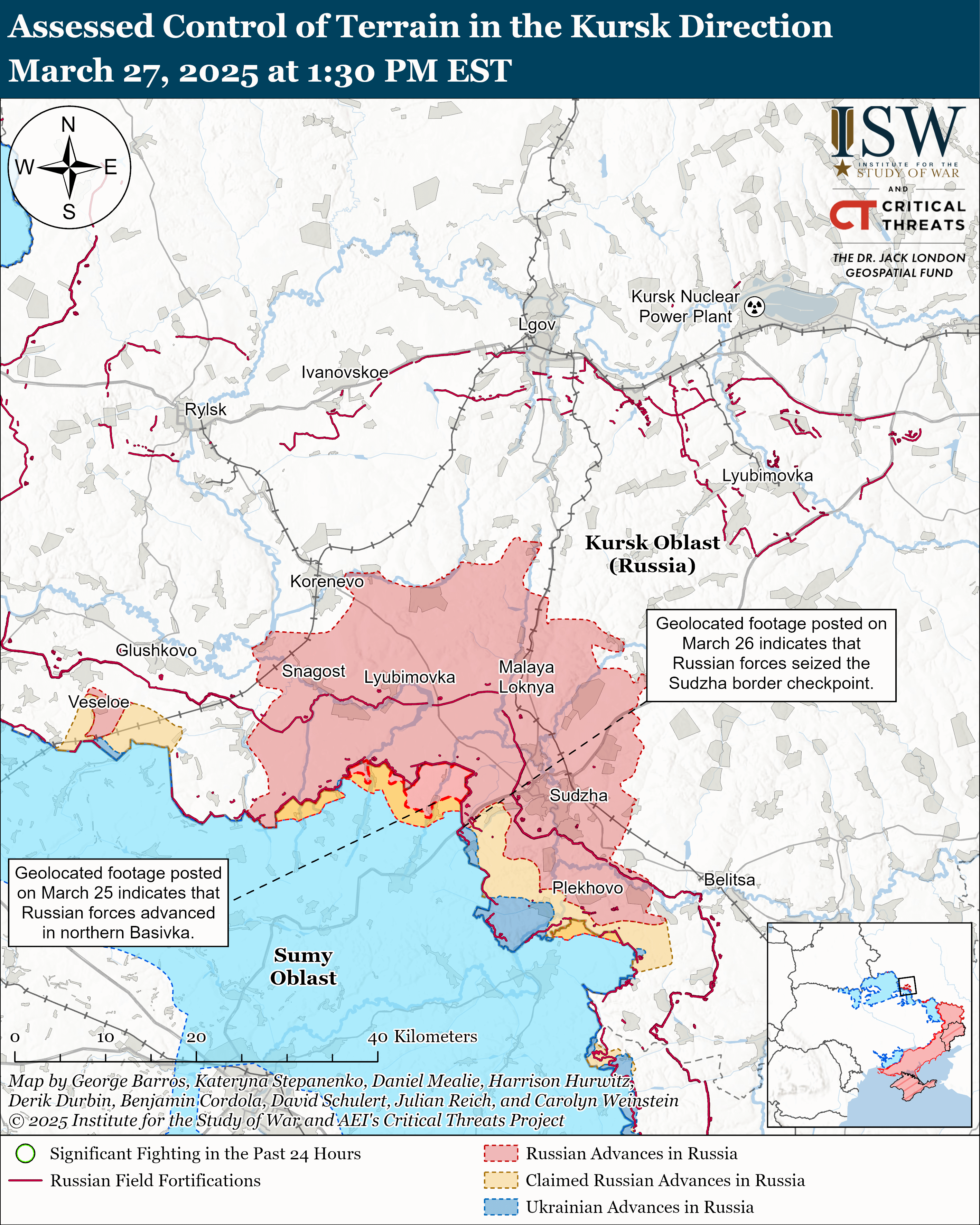 - Російські війська нещодавно просунулися в Курській області та на півночі Сумської області. Геолокаційні кадри, опубліковані 27 березня, показують, що російські загарбники нещодавно захопили Гоголівку Курської області та прикордонний контрольно-пропускний пункт Суджа. Додаткові геолокаційні кадри, опубліковані 25 березня, показують, що російські війська нещодавно просунулися біля Басівки у Сумській області.