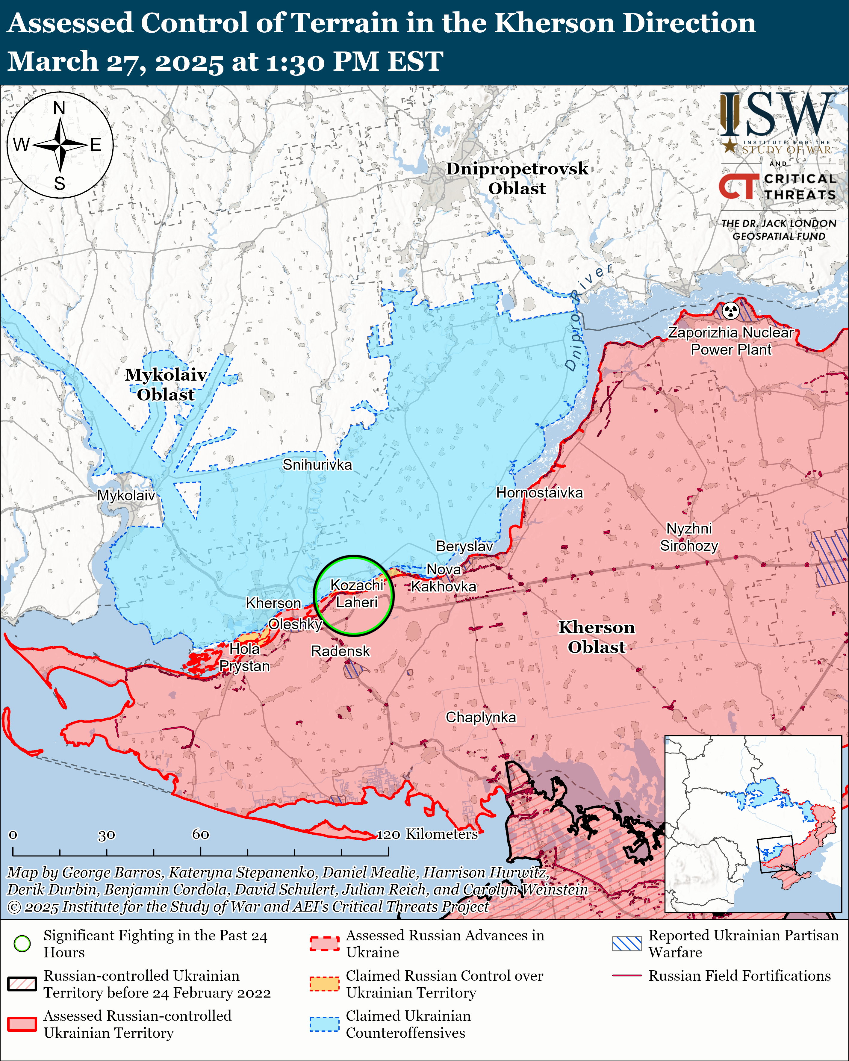 - Російські війська 26 і 27 березня вели обмежені наступальні операції на Херсонському напрямку, але не просунулися.