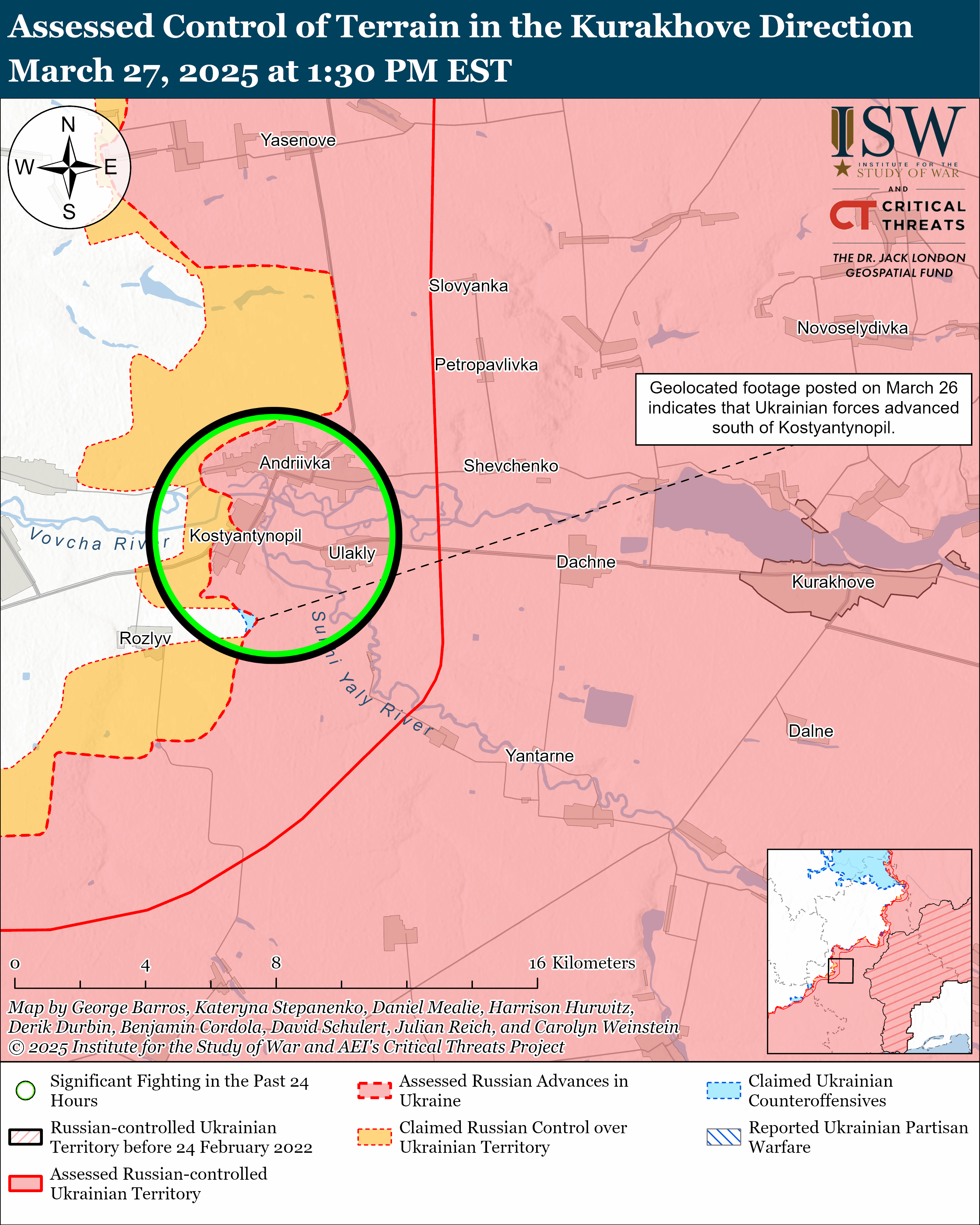 - Українські війська просунулися на Курахівському напрямку. Геолокаційні кадри, опубліковані 26 березня, свідчать, що українські сили нещодавно просунулися до смуги на південний схід від Костянтинополя (на захід від Курахового).