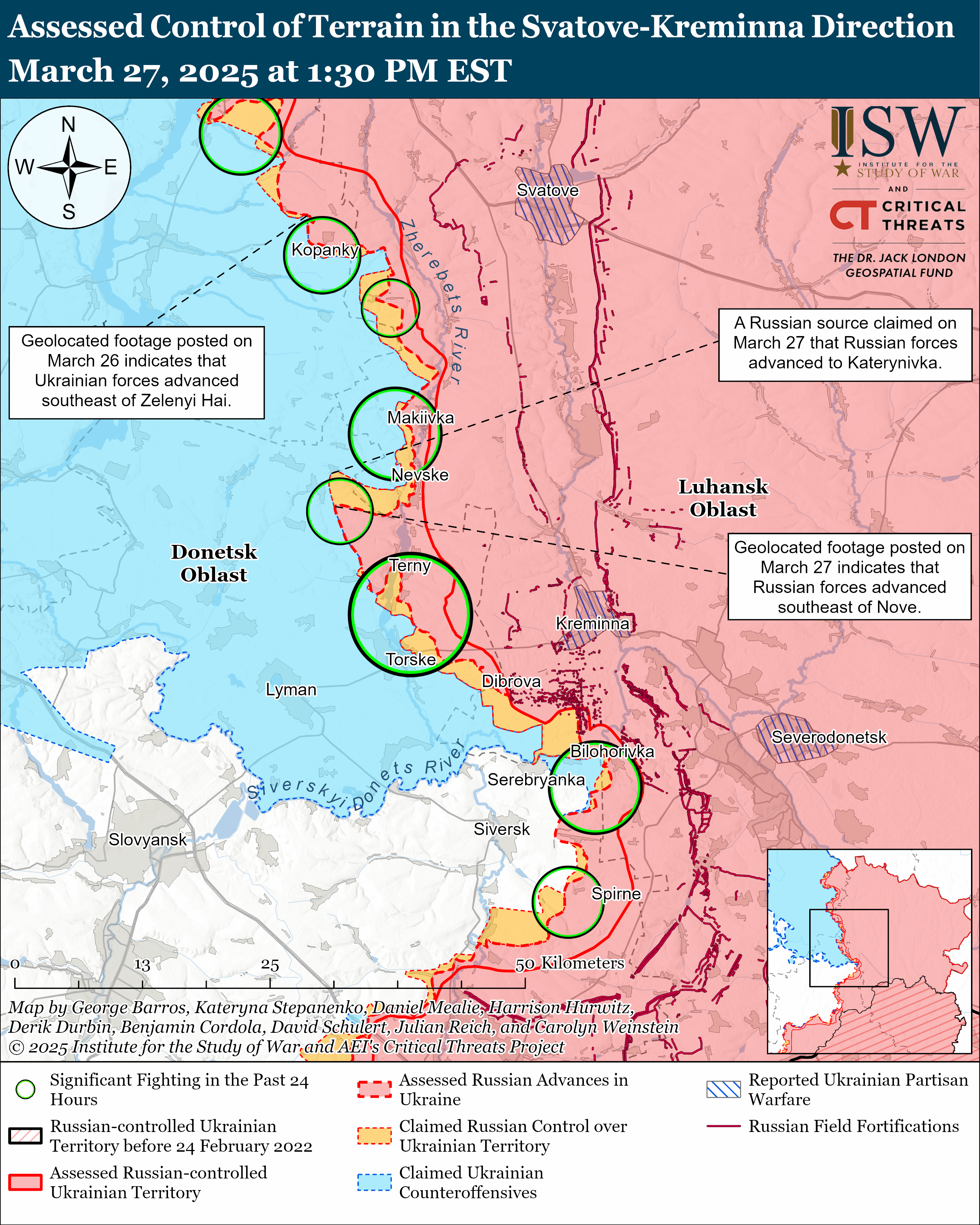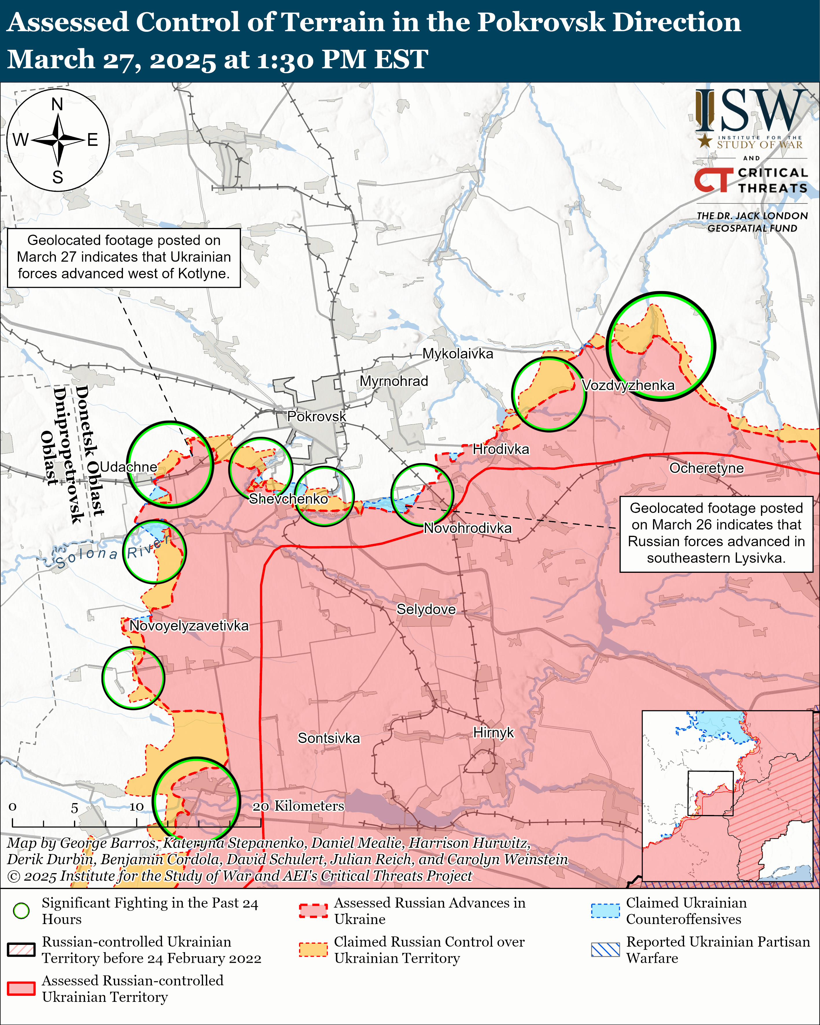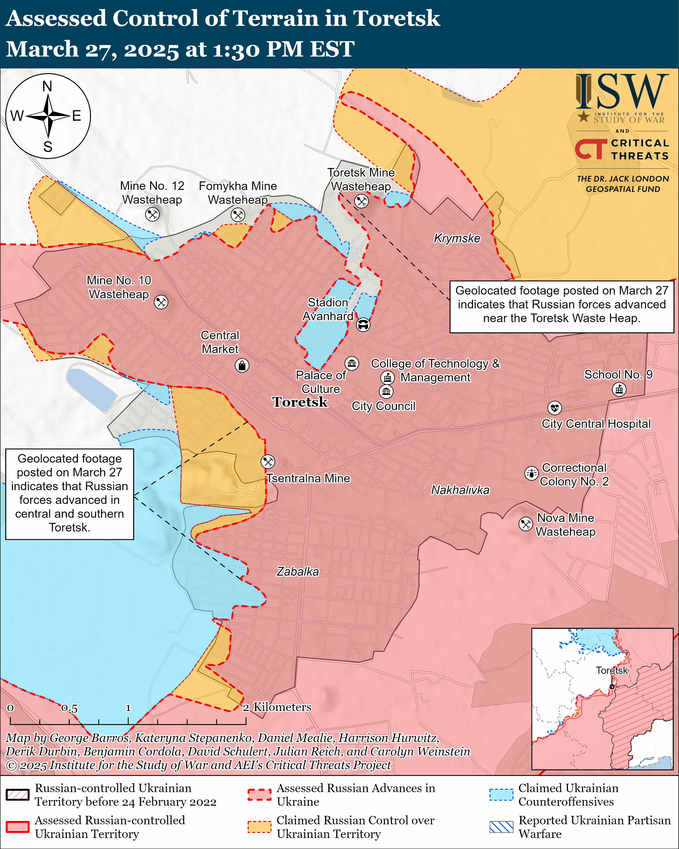 - Російські та українські війська нещодавно просунулися на Торецькому напрямку. Геолокаційні кадри, опубліковані 26 березня, показують, що українські сили нещодавно просунулися в центрі Олександрополя (на південний захід від Торецька). Інші відео показують, що російські війська нещодавно просунулися на північ від Торецька, у центрі Торецька та вздовж вулиці Сормовської на півдні міста.