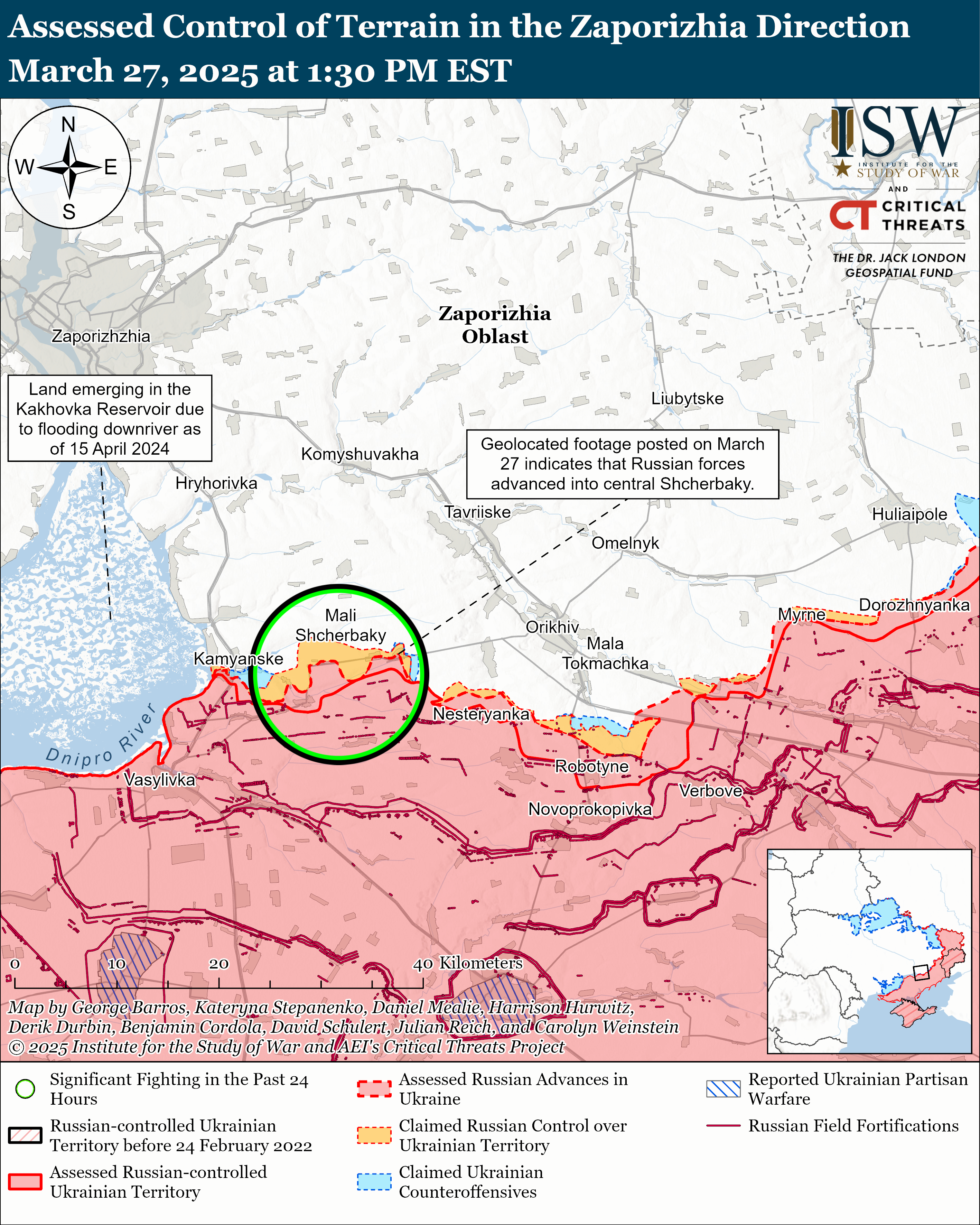 - Росіяни нещодавно просунулися на заході Запорізької області. Геолокаційні кадри, опубліковані 27 березня, показують, що окупанти нещодавно просунулися до центру Щербаків (на північний захід від Роботиного).