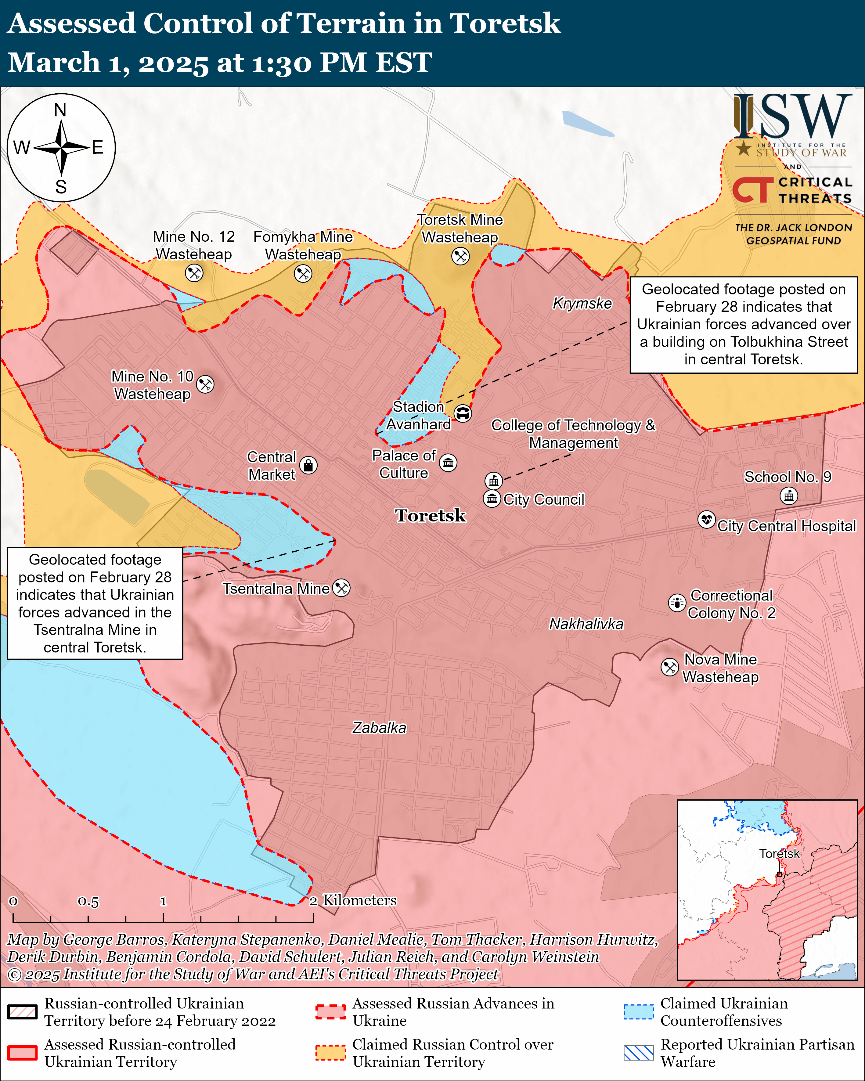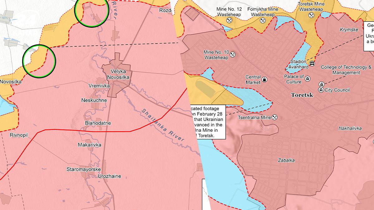 - Українські війська просунулися на Торецькому напрямку. Російські війська вели наступальні дії під самим Торецьком, біля Кримського, Дачного, Диліївки, Леонідівки та Щербинівки. Геолокаційні кадри, опубліковані 28 лютого, показують, що українські сили нещодавно просунулися поблизу вулиці Толбухіна та біля шахти "Центральна" у самому місті.